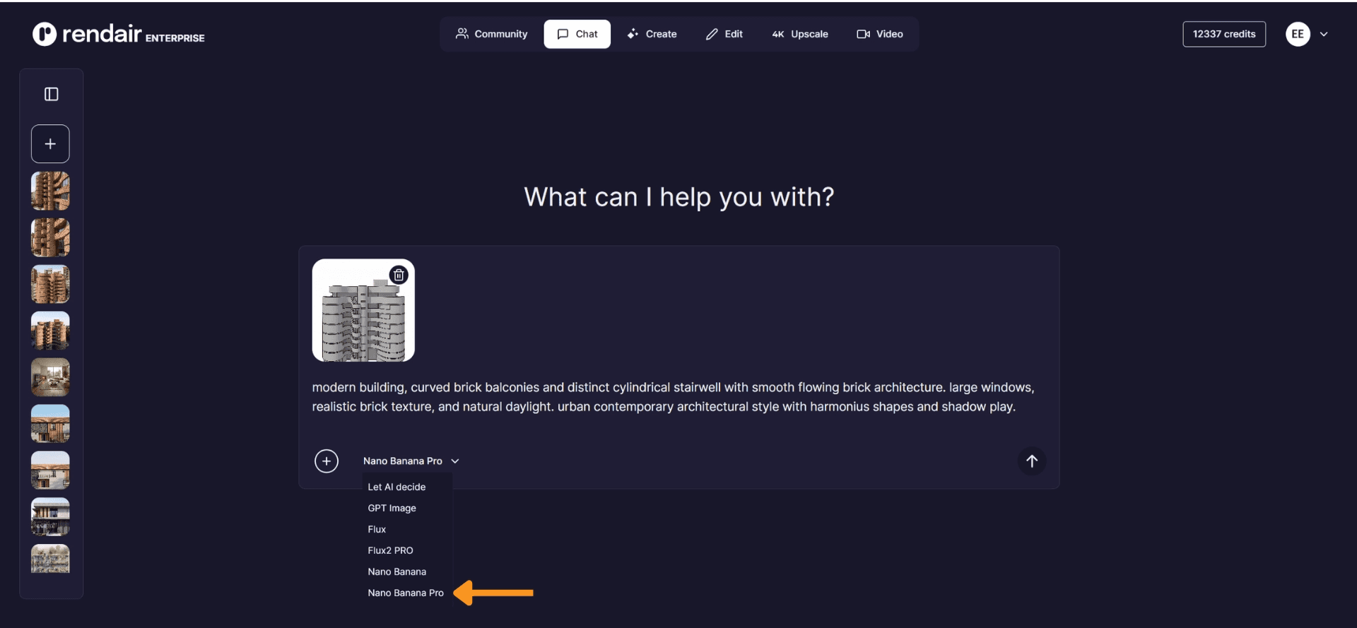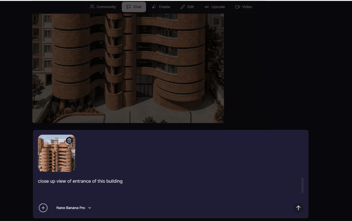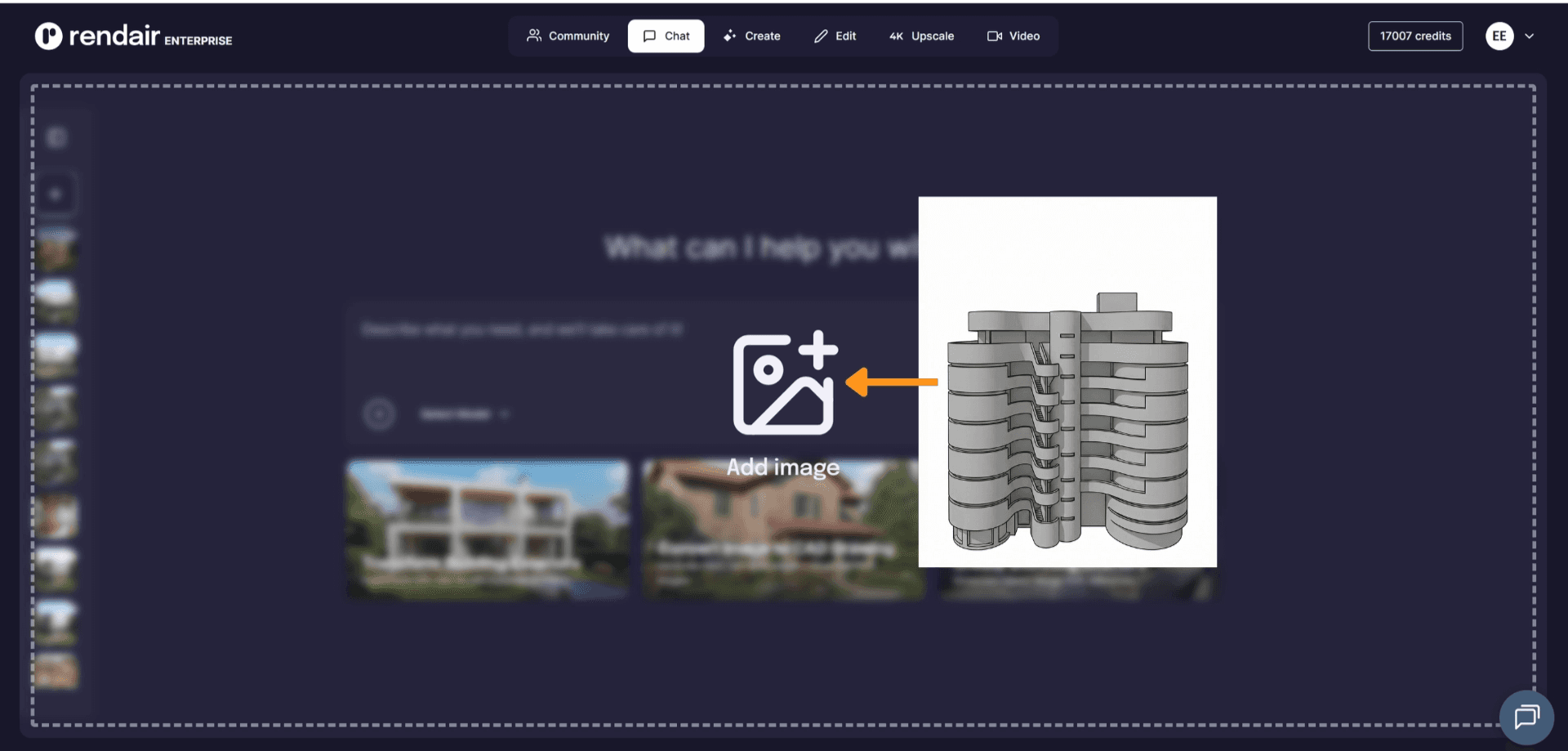 To create a video that feels like a drone flying around your building, we need to achieve consistent visuals. This is incredibly easy with Rendair AI! Just upload your rendered image to the chat and enter this prompt: