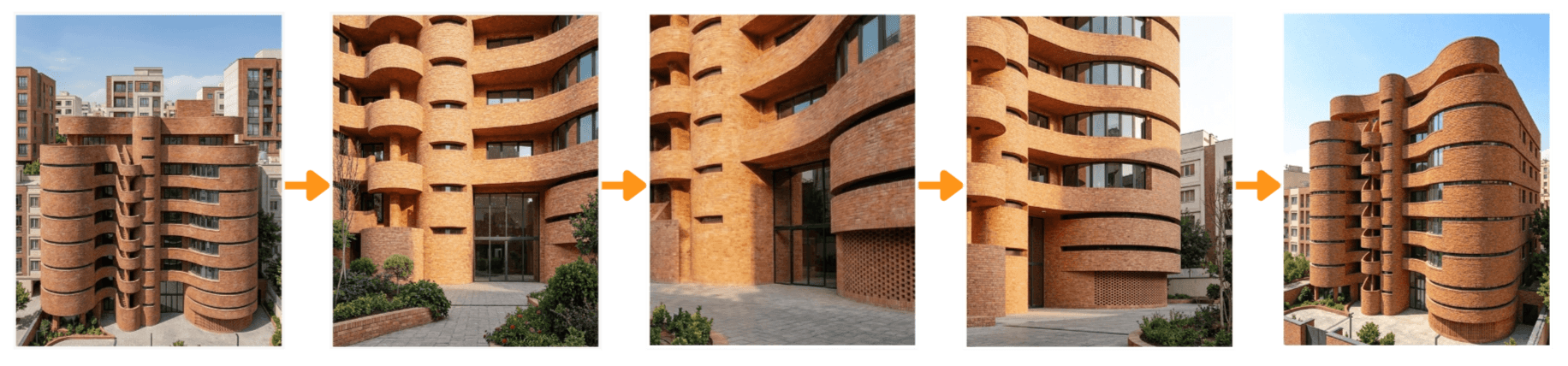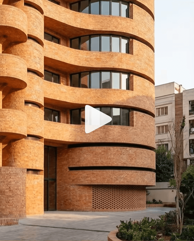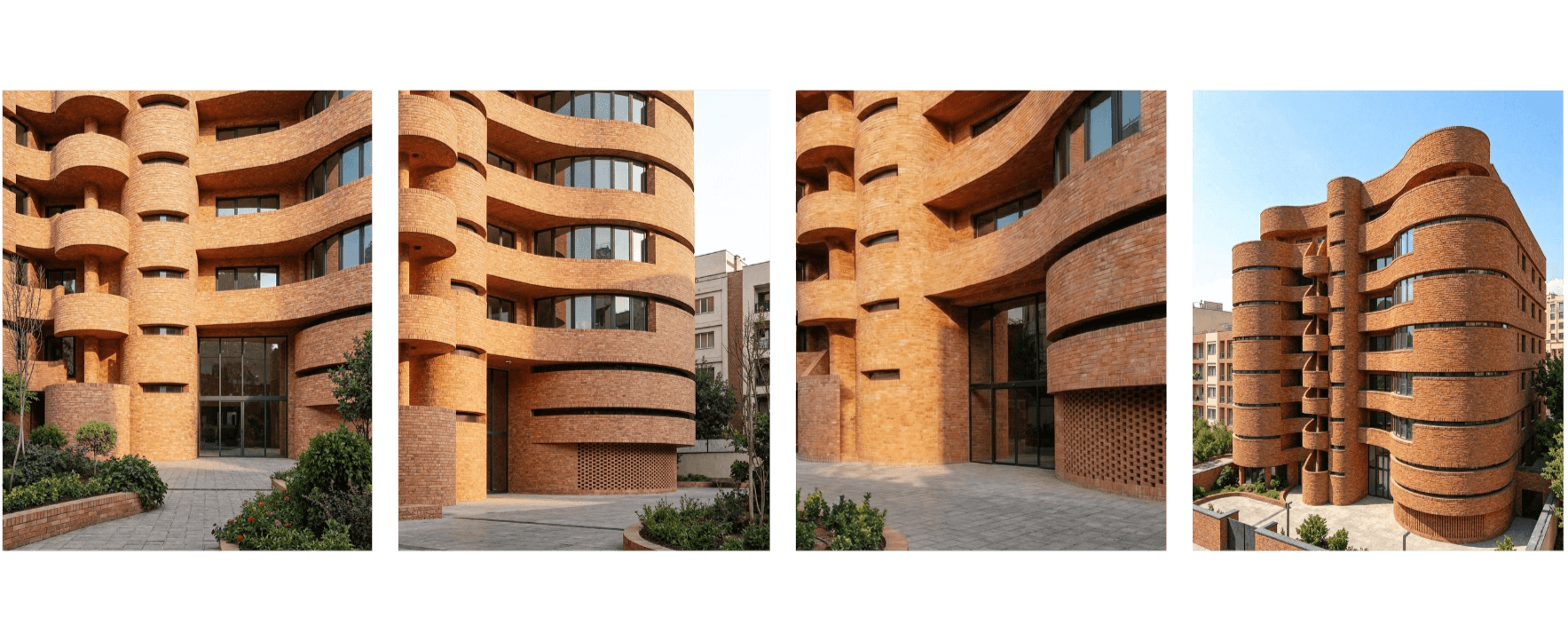“Modern building, curved brick balconies and distinct cylindrical stairwell with smooth flowing brick architecture. large windows, realistic brick texture, and natural daylight. urban contemporary architectural style with harmonius shapes and shadow play.”