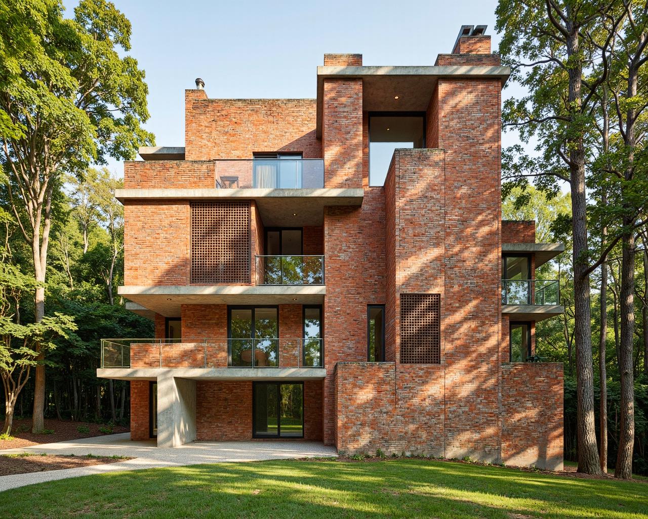 A stunning exterior shot of a contemporary multi-story villa featuring a facade of reclaimed red clay bricks with varied tonal transitions from deep orange to earthy brown. The architecture uses a mix of solid brick masses and open perforated brick screens that filter daylight. Exposed raw concrete beams frame the large floor-to-ceiling windows. Set in a lush green forest clearing during mid-afternoon sunlight, highlighting the rough, porous texture of the hand-made bricks. High dynamic range, photorealistic, extreme detail on the mortar and weathered brick edges.