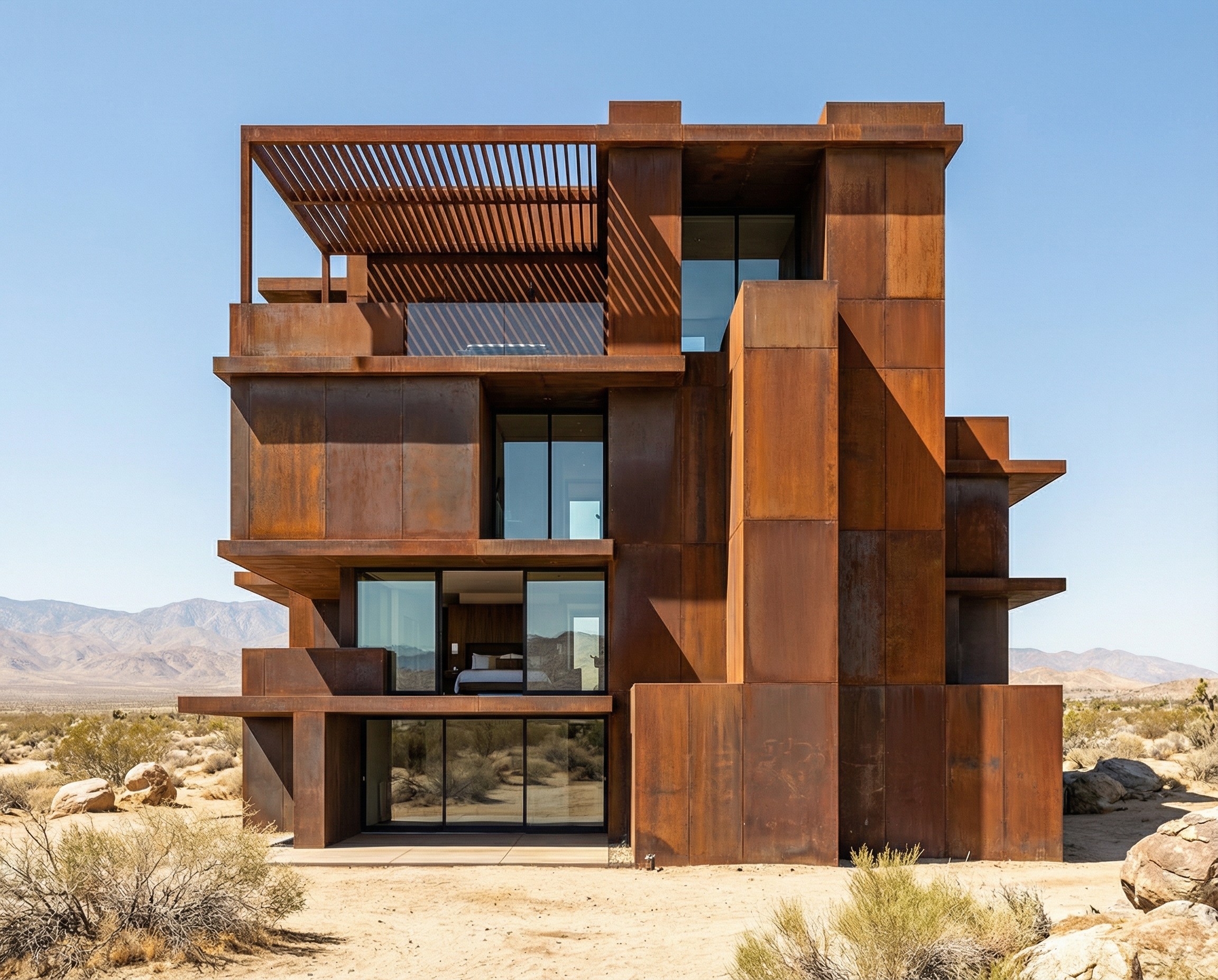 Contemporary desert villa clad in weathered Corten steel. Massive sliding glass doors, terrace shaded by a rusted steel pergola. Sharp midday sun, high-contrast shadows. Heat haze in the background, ultra-sharp focus on the transition between glass and rust.