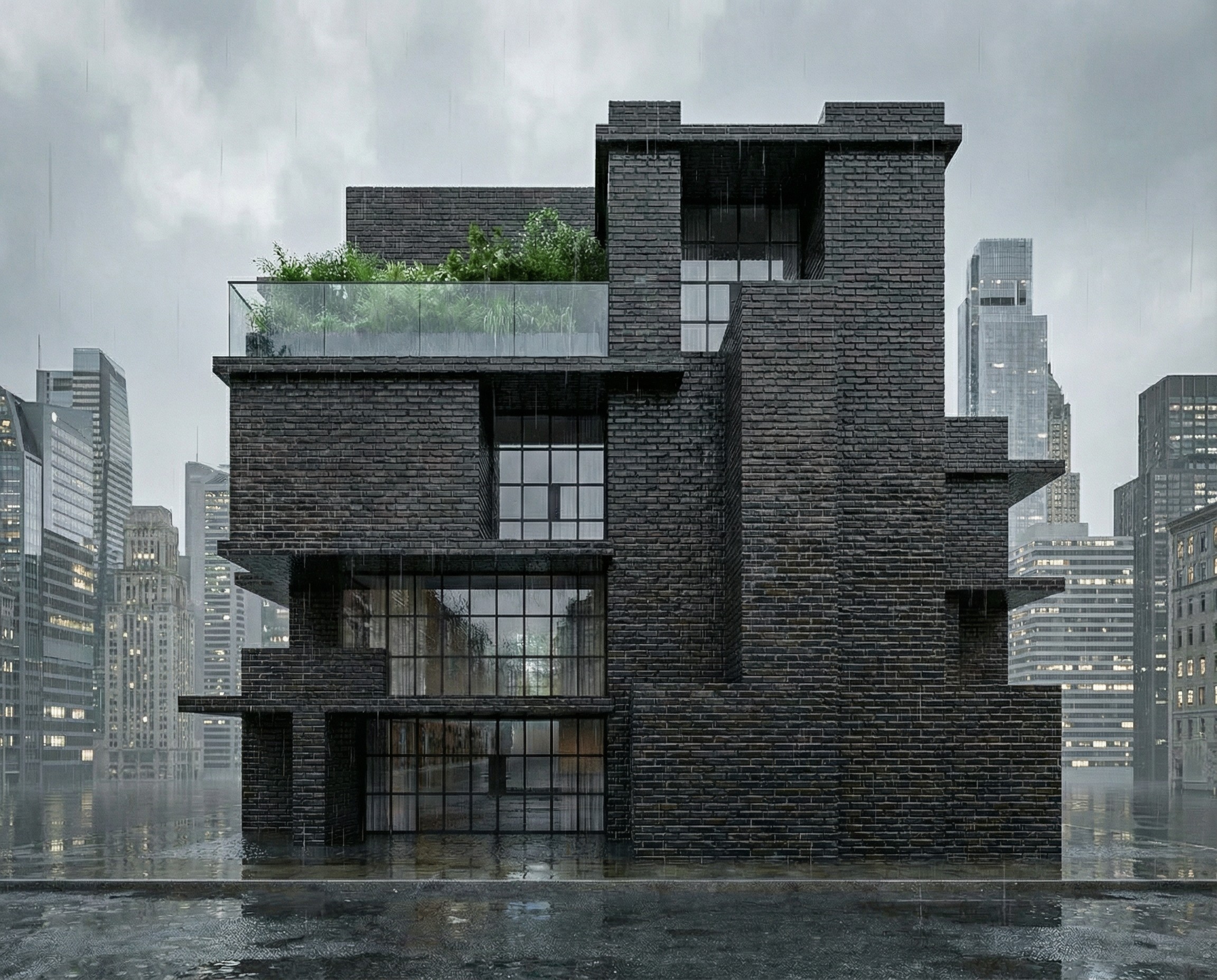 Modern London townhouse of dark charcoal hand-struck bricks. Includes wide industrial-style steel-framed windows and a terrace with a glass perimeter and lush greenery. The brick and glass appear glossy under the light rain. focus on the wet texture of the brick and glass.