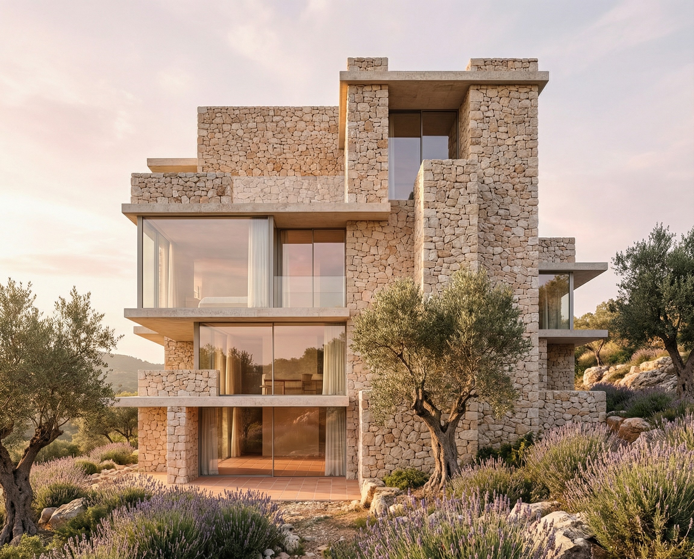A stunning daylight architectural shot of the house model on a sun-drenched Mediterranean hillside during early dawn. The exterior is made of hand-cut local limestone with a rough, porous texture. The large glass facade reflects the soft pink and gold hues of the hazy morning sky. Surrounded by gnarled olive trees and wild lavender. Through the glass, a breezy minimalist interior with terracotta floors is visible. High dynamic range, photorealistic, evoking the fresh and silent feeling of a summer morning.