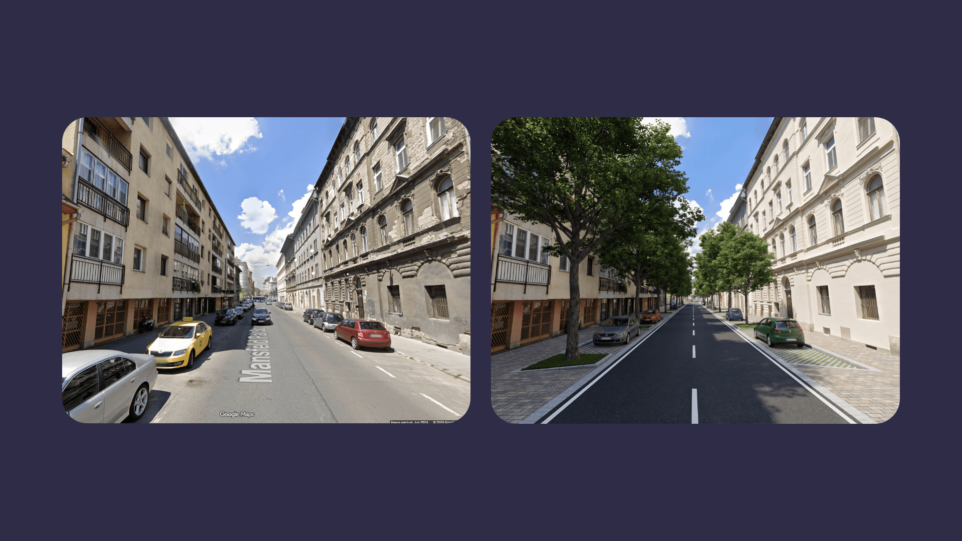 A completely new street experience—more livable, shaded, and balanced between cars and pedestrians.