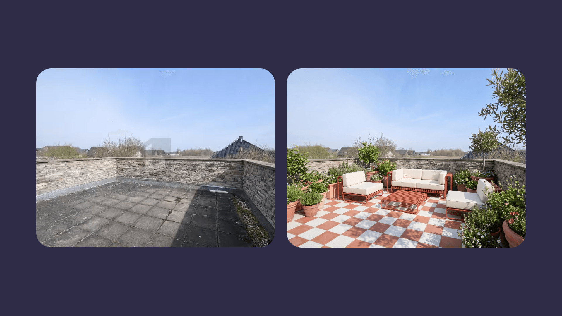 AI generates multiple realistic terrace layouts with different furniture arrangements and material combinations.