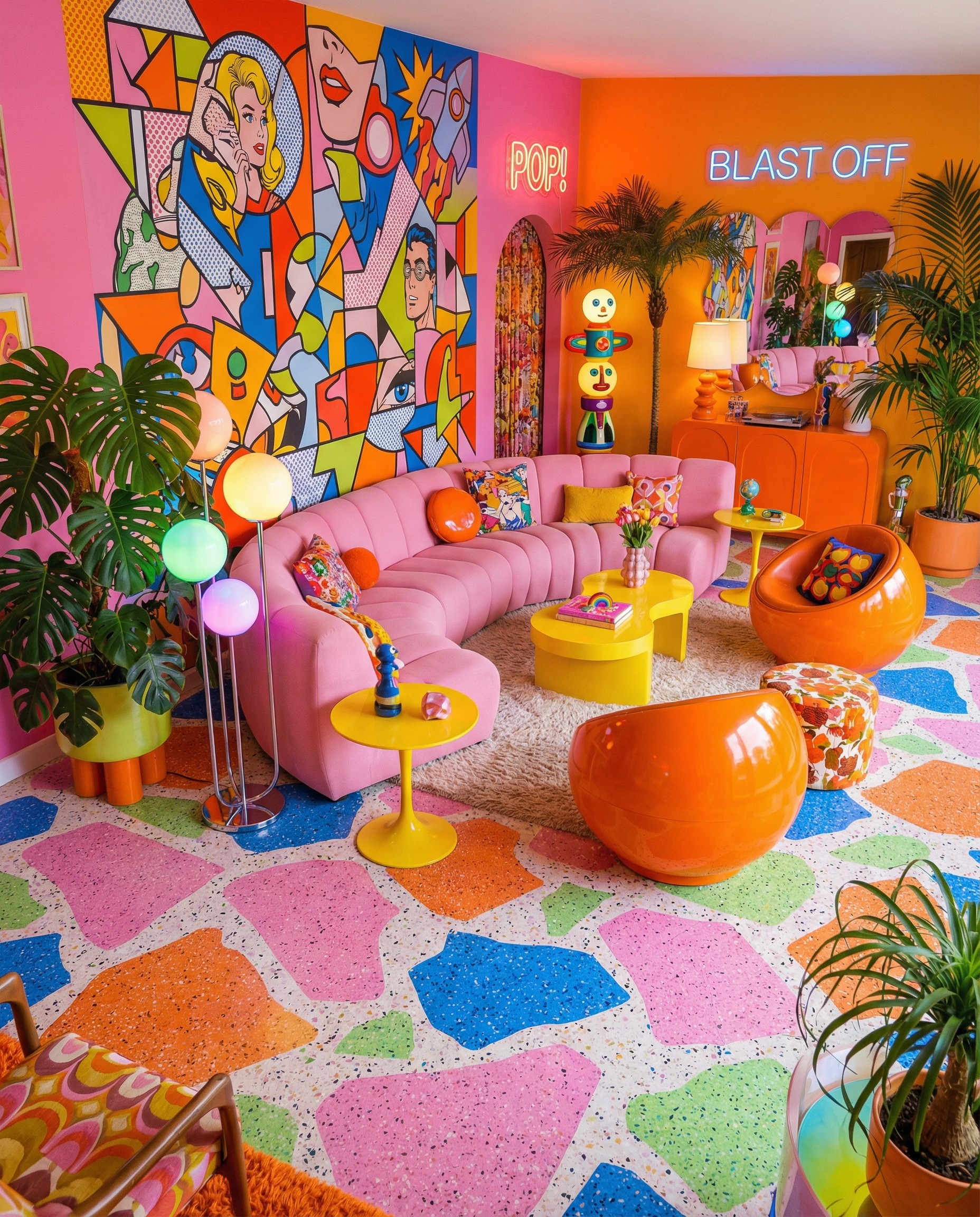 A photorealistic, high-energy maximalist living room blending Pop-Art and 60s Space Age design. The floor is an oversized white terrazzo with gigantic, amorphous vivid color blocks. Bubblegum pink and bright orange walls showcase a massive abstract Cubist Pop-Art mural. Furniture is purely biomorphic: a curvy pink modular sofa, glossy orange capsule chairs, and yellow tulip tables. Glowing globe floor lamps, a quirky totem light, neon signs, and oversized indoor Monstera plants complete this vibrant, retro-futuristic atmosphere. 8k, highly detailed.
