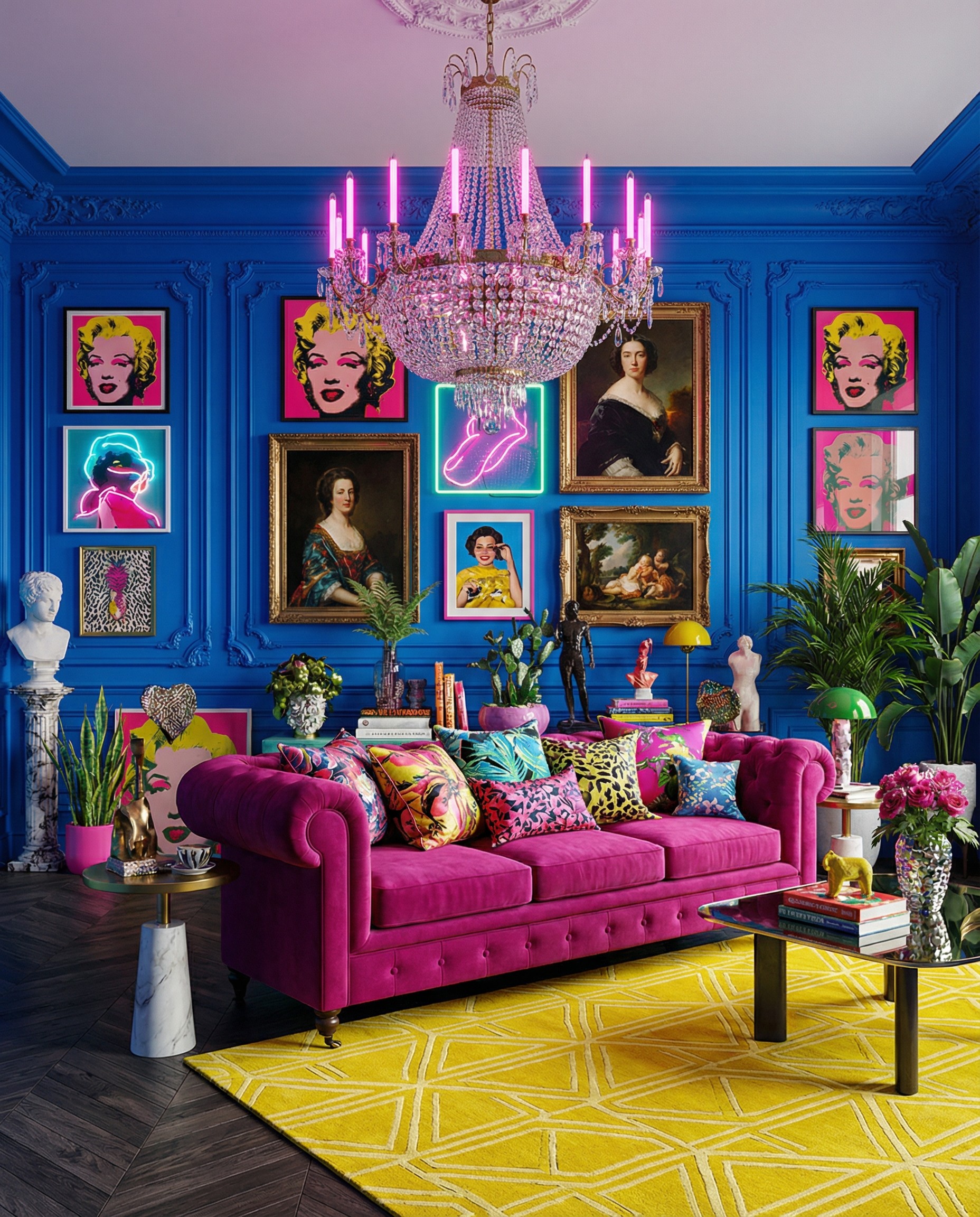 A hyper-detailed maximalist living room bursting with vibrant colors. Ornate classical wall moldings painted in electric blue. A plush magenta velvet Chesterfield sofa covered in clashing patterned silk cushions. The walls are covered edge-to-edge with an eclectic mix of neon pop-art and framed classical oil paintings. A bright yellow geometric rug lies over a dark herringbone wood floor. A massive, ornate crystal chandelier customized with neon pink light tubes. 8k, photorealistic, interior design magazine editorial.