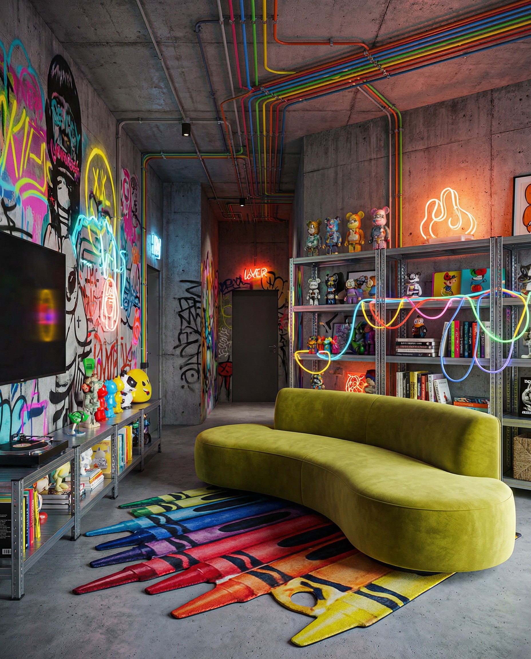 A hyper-detailed maximalist living room where raw, brutalist concrete walls clash with an explosion of vibrant color. The exposed concrete surfaces are heavily tagged with overlapping neon-colored street art murals and graffiti. A curved, chartreuse green velvet sofa sits on a rug that resembles a melted crayon spill of reds, blues, and yellows. Industrial metal shelving is overflowing with colorful vinyl toys, art books, and tangled colored LED tubes. Exposed colorful conduit pipes run across the ceiling. Cinematic lighting contrasting cold concrete with warm neon glows, 8k, photorealistic textures.