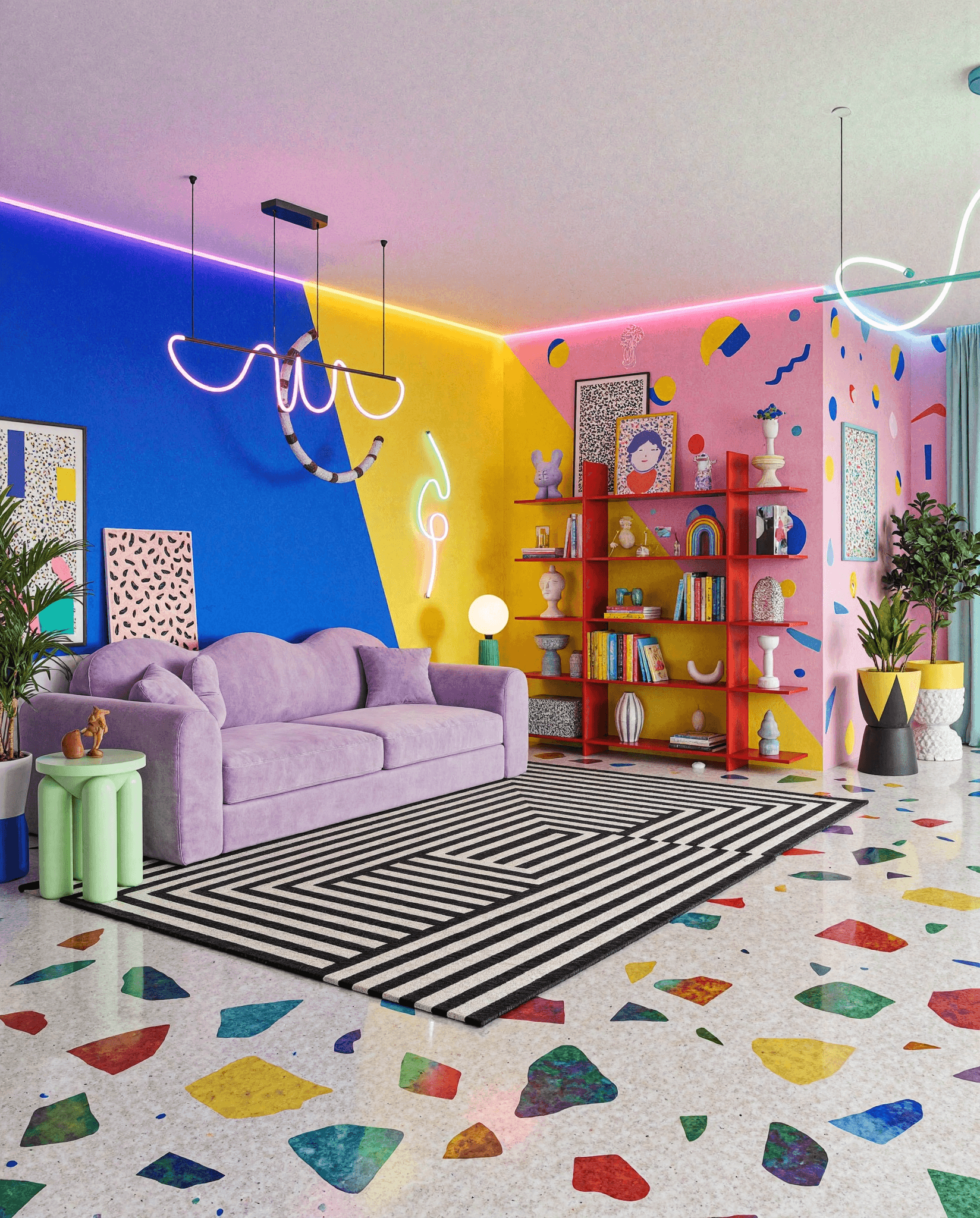 An eye-catching, vibrant maximalist living room inspired by modern Memphis design revival. The space is a highly aesthetic playground of color and geometry. Walls feature bold, asymmetrical color-blocking in electric blue, sunny yellow, and bubblegum pink. The floor is an oversized, highly polished colorful terrazzo with large, vivid fragments of quartz and colored glass. Furnished with quirky, modern sculptural pieces: a wavy lilac sofa, a bright red asymmetric bookshelf filled with eccentric colorful objects, and a black-and-white striped geometric rug. Vibrant, playful, high-energy atmospheric lighting. 8k, architectural visualization, photorealistic, ultra-crisp macro details.