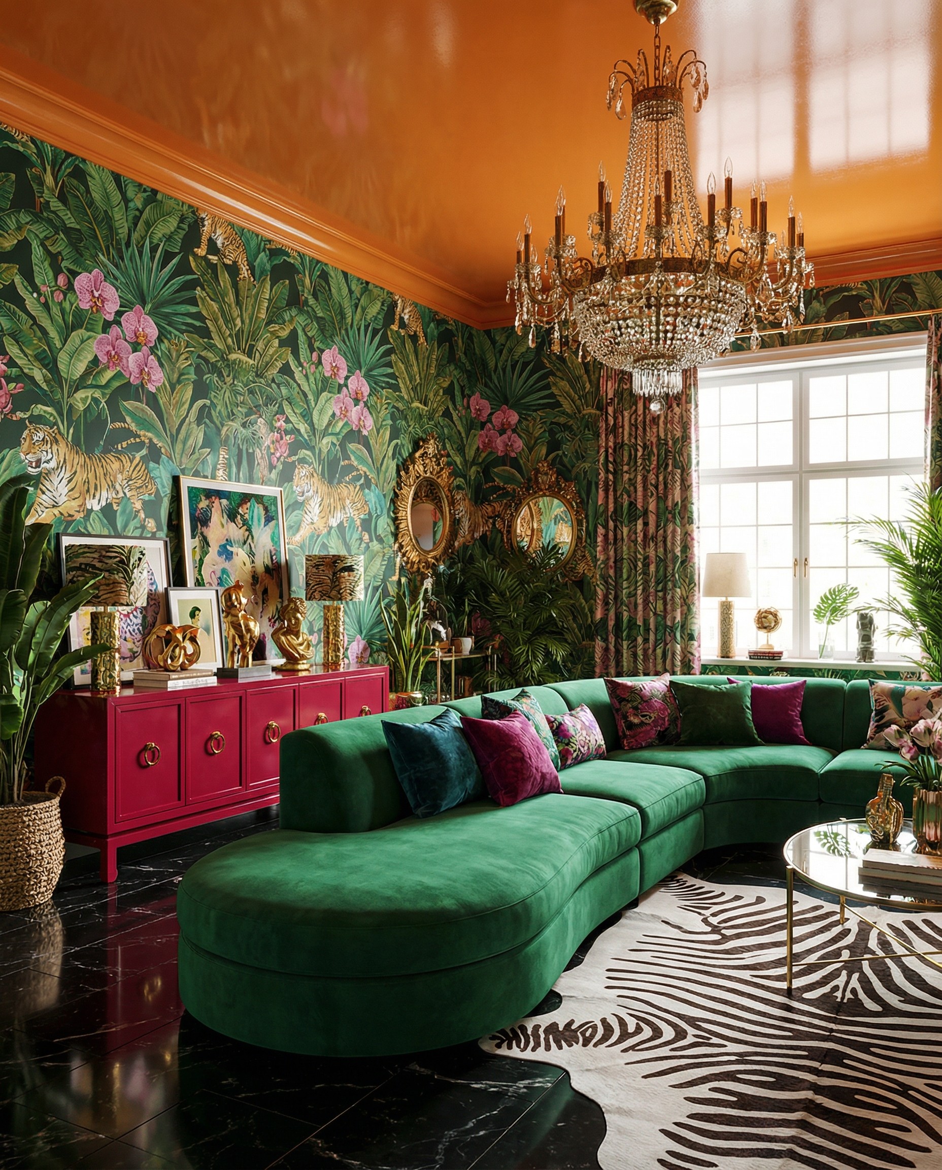A breathtaking, ultra-maximalist living room interior featuring dramatic custom botanical jungle wallpaper in vivid greens, bright pinks, and gold accents. The furnished space is an explosion of jewel tones and modern luxury. The centerpiece is a massive, curved emerald-green velvet sectional sofa, paired with a vibrant ruby-red lacquered sideboard. A huge, ornate brass and crystal chandelier hangs from a ceiling painted in high-gloss tangerine orange. A bold black-and-white zebra print rug lies on a polished black marble floor. Eclectic decor, gold accents, maximalist perfection, photorealistic, 8k, Octane Render, cinematic lighting, incredibly detailed.