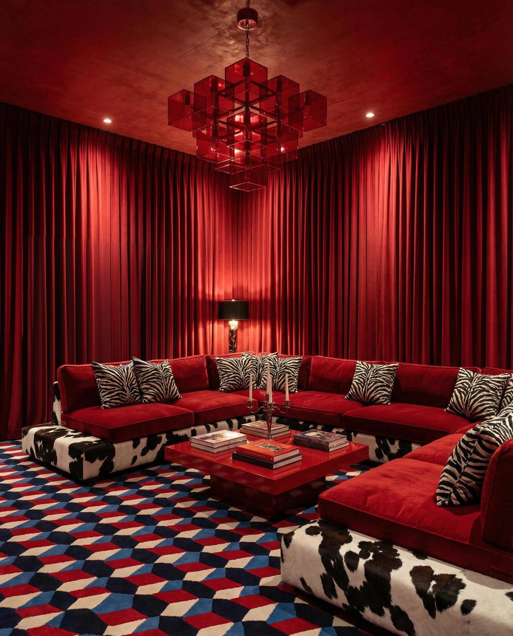 A highly theatrical, maximalist living room drenched in immersive monochrome deep blood red. The walls are draped entirely in heavy, floor-to-ceiling red velvet theater curtains, setting a dramatic stage. The ceiling is a textured matte red. The centerpiece is a massive, low-profile platform sectional sofa that mimics the bed in the image: its base is upholstered in bold black-and-white cowhide print, holding deep red velvet seat cushions piled with contrasting zebra print pillows. Above a glossy red coffee table hangs the oversized, geometric chandelier made of translucent red acrylic cubes. The floor features the exact graphic 3D cube pattern rug in clashing red, blue, white, and black hues. Dramatic, moody, luxurious cinematic lighting. 8k resolution, highly detailed textures.