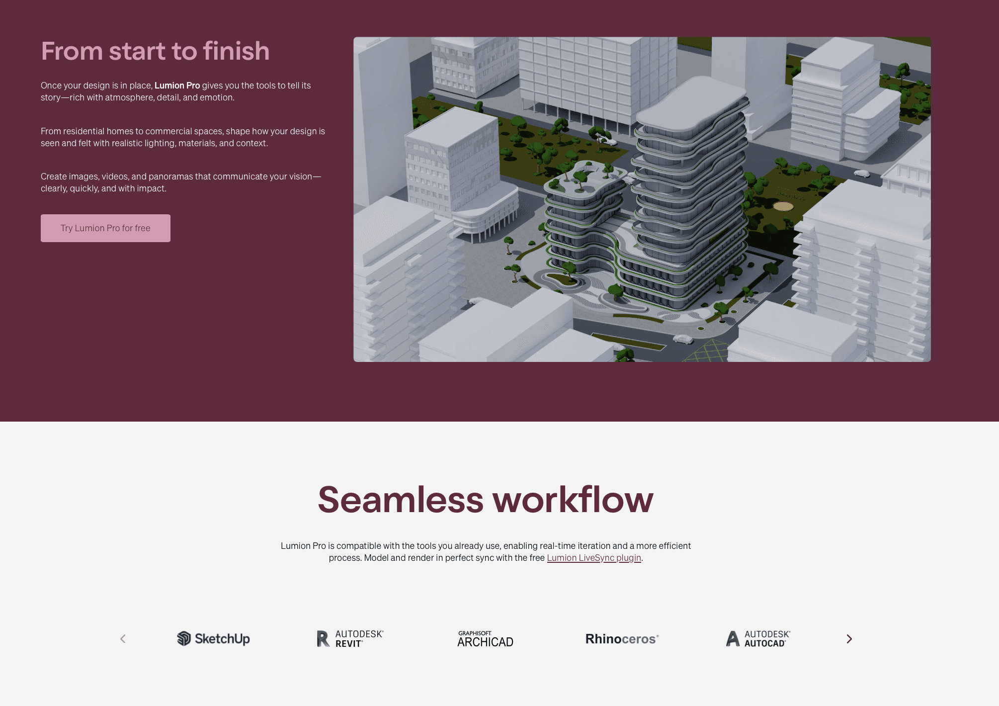 Lumion is built for architects who need to visualize designs fast. It works directly with your CAD software and requires very little training to produce professional results. It is a "what you see is what you get" tool optimized for deadlines.