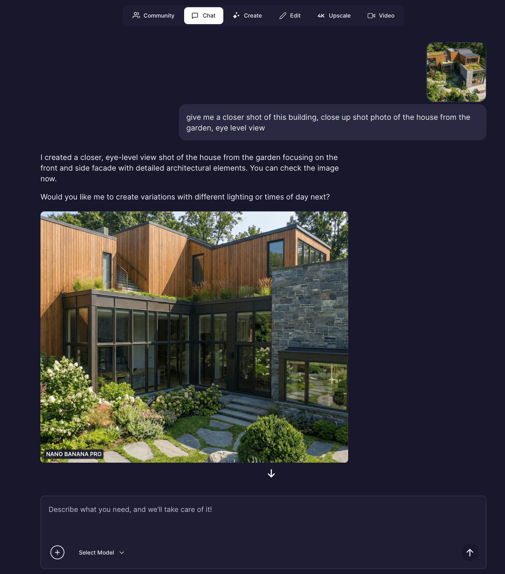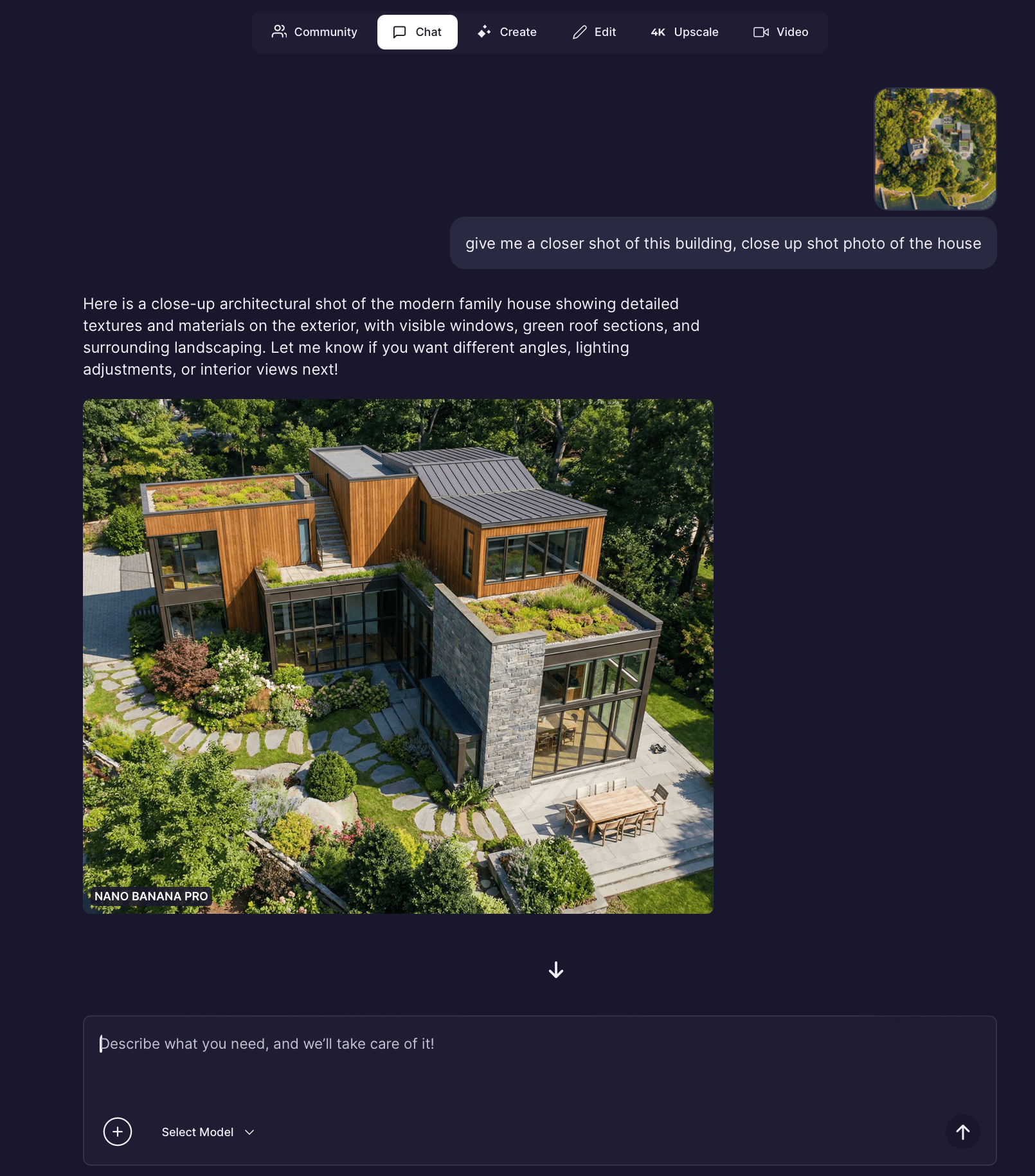 The chat will generate a closer, more detailed perspective render of the house.
