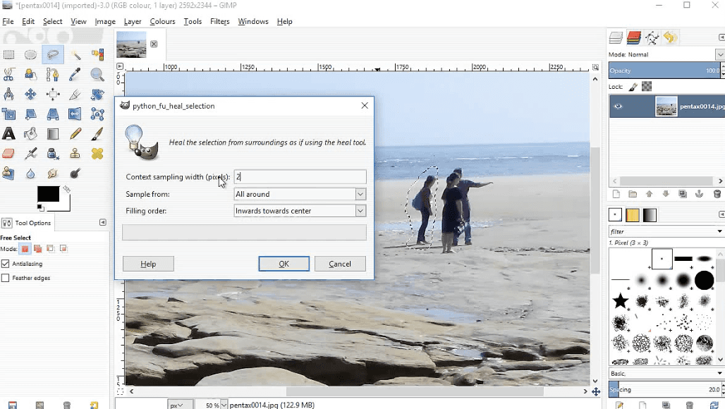 This plugin adds the "Heal Selection" tool, which intelligently fills a selected area using textures from the surrounding image.