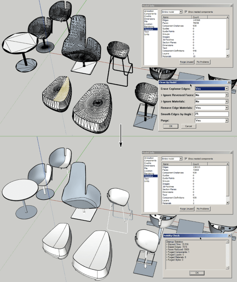 Why it matters: Interior files get heavy quickly with imported furniture models. This plugin reduces file size by removing stray edges and duplicate materials, keeping your model responsive.