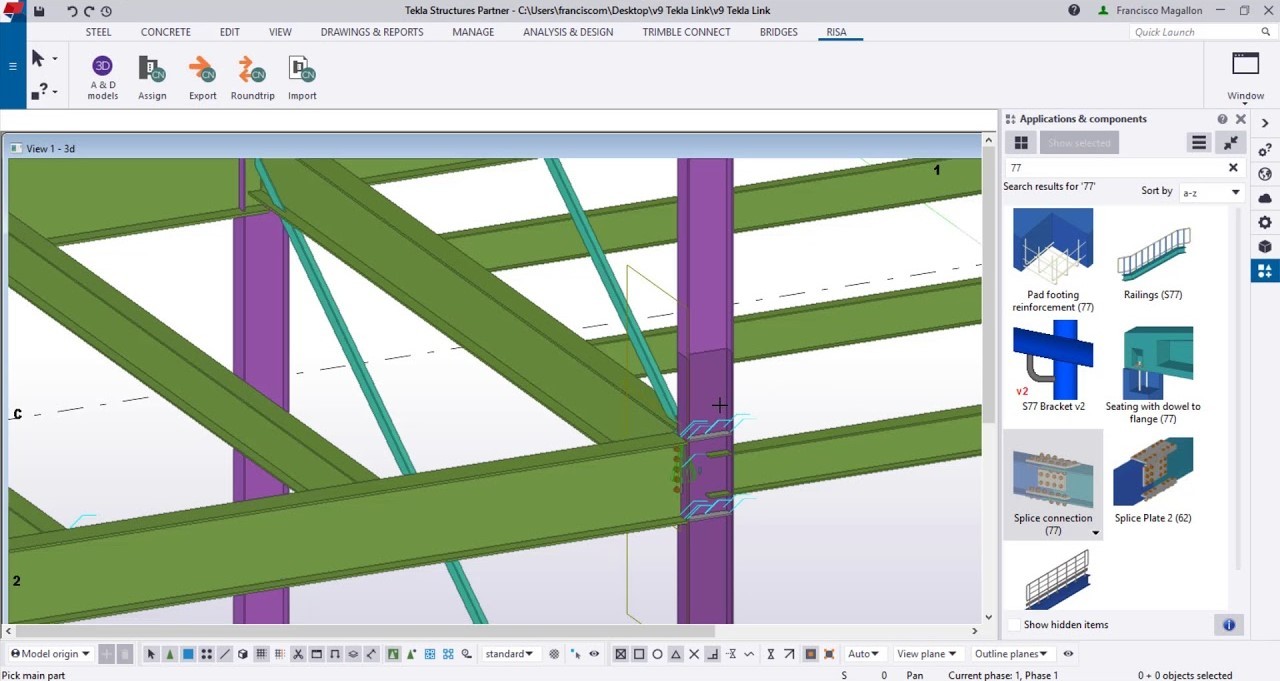 Why it matters: It prevents the "re-modeling" cycle. You can start the physical model in Tekla, send it to analysis, size the members, and import the changes back into Tekla. The link maps sections and materials, keeping the physical and analytical models in sync.