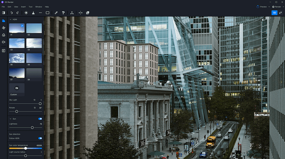 D5 Render se centra en funciones de "montaje de escena". Incluye sistemas meteorológicos (lluvia, nieve), una herramienta de dispersión de vegetación y una biblioteca integrada de personas y vehículos animados. Está diseñado para vestir una escena rápidamente.