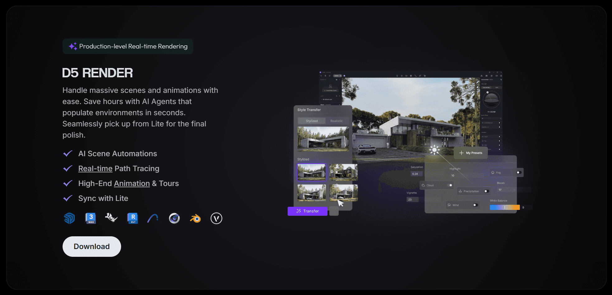D5 Render es el especialista especializado. Está diseñado específicamente para arquitectos y diseñadores de interiores que necesitan renderizados fotorealistas de alta calidad con una configuración mínima. Se integra perfectamente con software CAD como Revit, SketchUp y Rhino, permitiendo un flujo de trabajo de "lo que ves es lo que obtienes" que prioriza la eficiencia.