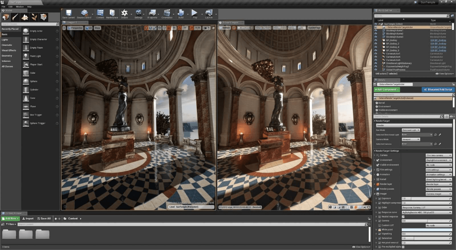 Octane se centra puramente en la imagen. Sus funciones giran en torno a materiales, niebla volumétrica y efectos de cámara. Unreal Engine es un conjunto de creación. Incluye esculpido de terreno, dispersión de vegetación, simulación física y scripting visual. Unreal ofrece un conjunto completo de herramientas para construir mundos, mientras que Octane es estrictamente una cámara y revelador de película.