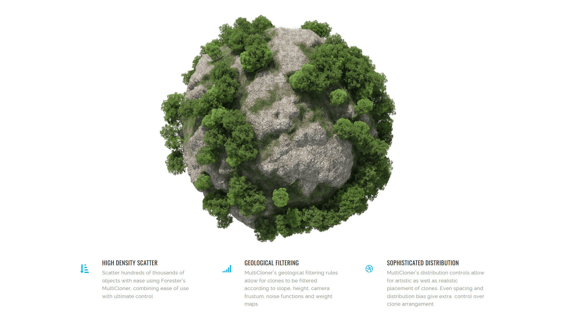 Por qué importa: A diferencia de los modelos estáticos, los árboles de Forester pueden ser animados para efectos de viento. Se integra con Redshift para renderizar estos activos de alta poligonización de manera eficiente usando Multi-Instancias, evitando sobrecargas de memoria durante la fase de traducción.