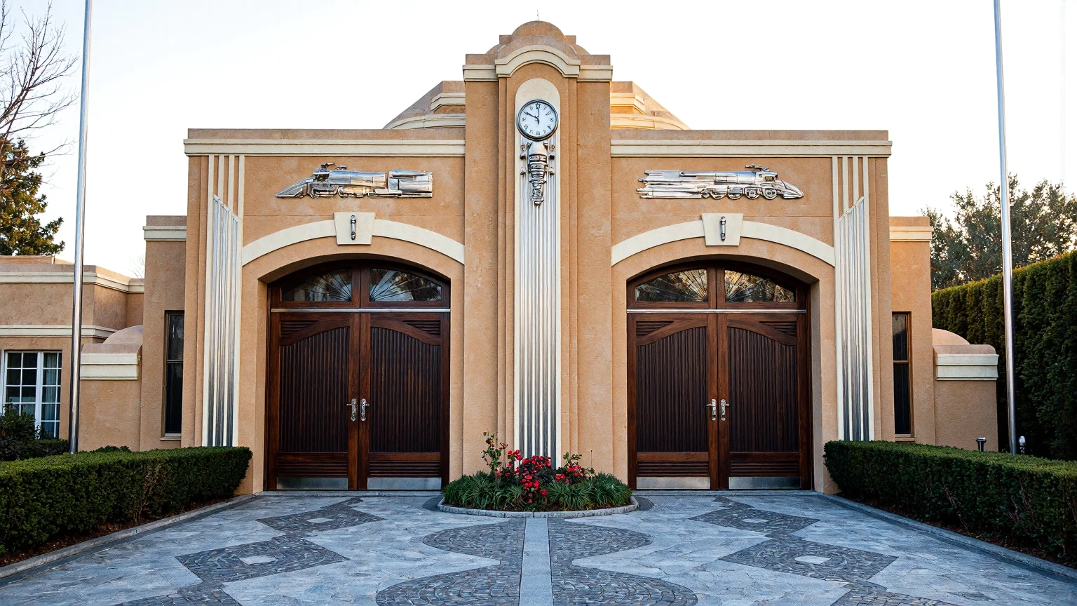 Garaje Art Deco con diseño simétrico, paredes de arenisca pulida, elementos de cromo, puertas de caoba con diseños plateados, techo en forma de pirámide escalonada, banderas, columnas decorativas, caminos de adoquines y una esbelta torre del reloj.