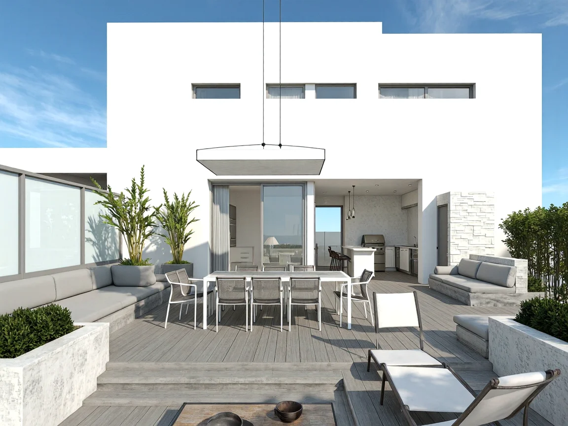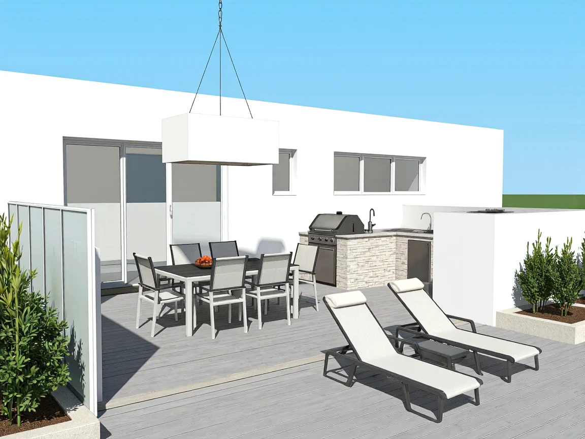 Diseño de deck de estilo internacional con casa blanca minimalista, ventanas de vidrio y techo plano. Las características incluyen decking compuesto gris, asientos de concreto empotrados con respaldo de vidrio esmerilado, mesa de comedor blanca con seis sillas de malla, lámpara colgante de gran tamaño, cocina al aire libre, sillas de lounge modernas y jardineras estructuradas con bambú y boj.