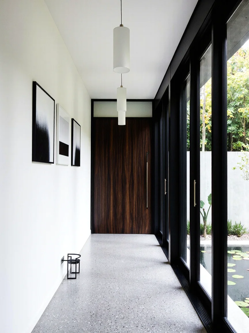 Pasillo de Estilo Internacional con ventanas de suelo a techo, una gran puerta de madera oscura con manija de acero cepillado, ventana transom de vidrio esmerilado, paredes blancas mate, grandes obras de arte monocromáticas, paneles de vidrio con vistas a un jardín zen, suelo de terrazo, luces colgantes cilíndricas y plantas serpiente.