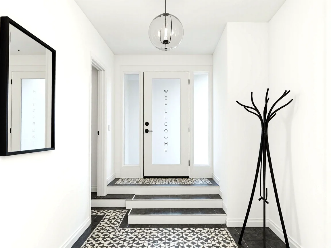 Foyer minimalista con paredes blancas, espejo negro, perchero de metal abstracto, suelo de baldosas geométricas en blanco y negro, gran ventanal y una lámpara colgante.