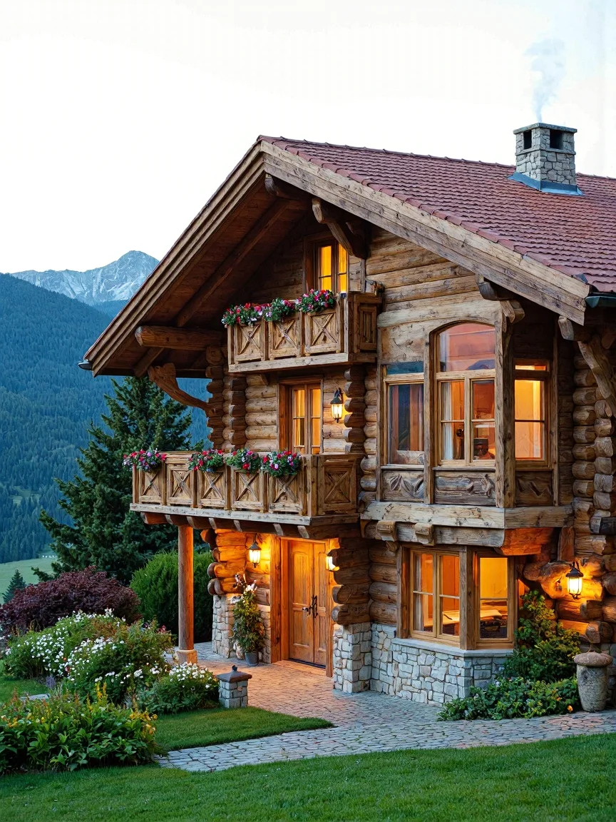 Cabaña de montaña en un paisaje alpino al atardecer, estilo tradicional de chalet suizo con madera envejecida, balcón envolvente, ventana salediza, techo de tejas rojas y césped cuidado.