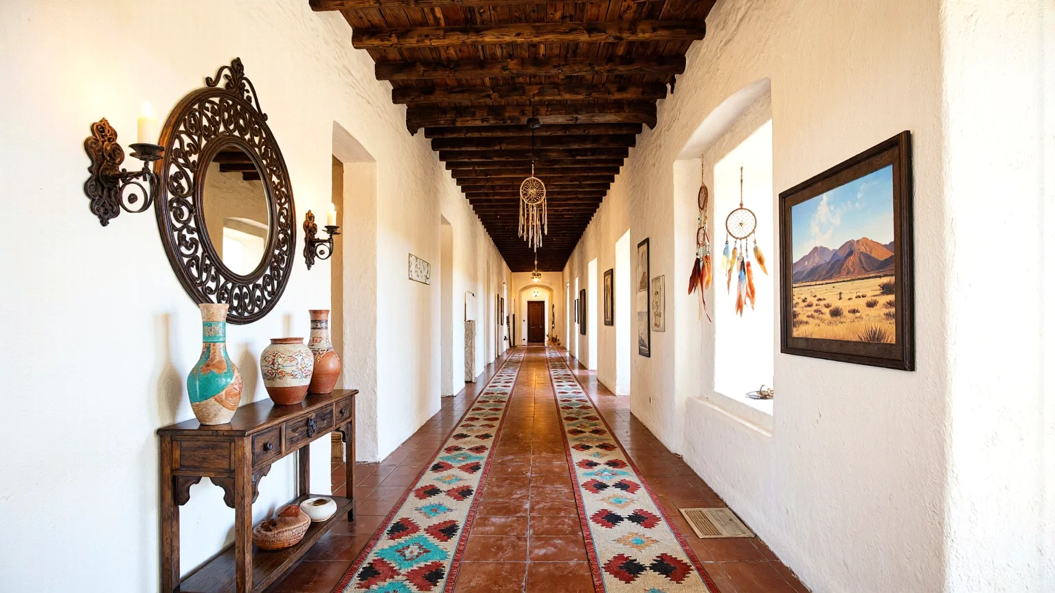 Diseña un largo pasillo rectangular del suroeste con paredes de adobe blanco roto y vigas de madera. Incluye un suelo de baldosas Saltillo de sienna quemada, coloridas alfombras tejidas, una antigua mesa consola de color marrón oscuro con un espejo redondo de hierro forjado encima, apliques de barro con velas de cera de abejas, cerámica navajo, arte enmarcado de paisajes del desierto y atrapasueños tejidos.