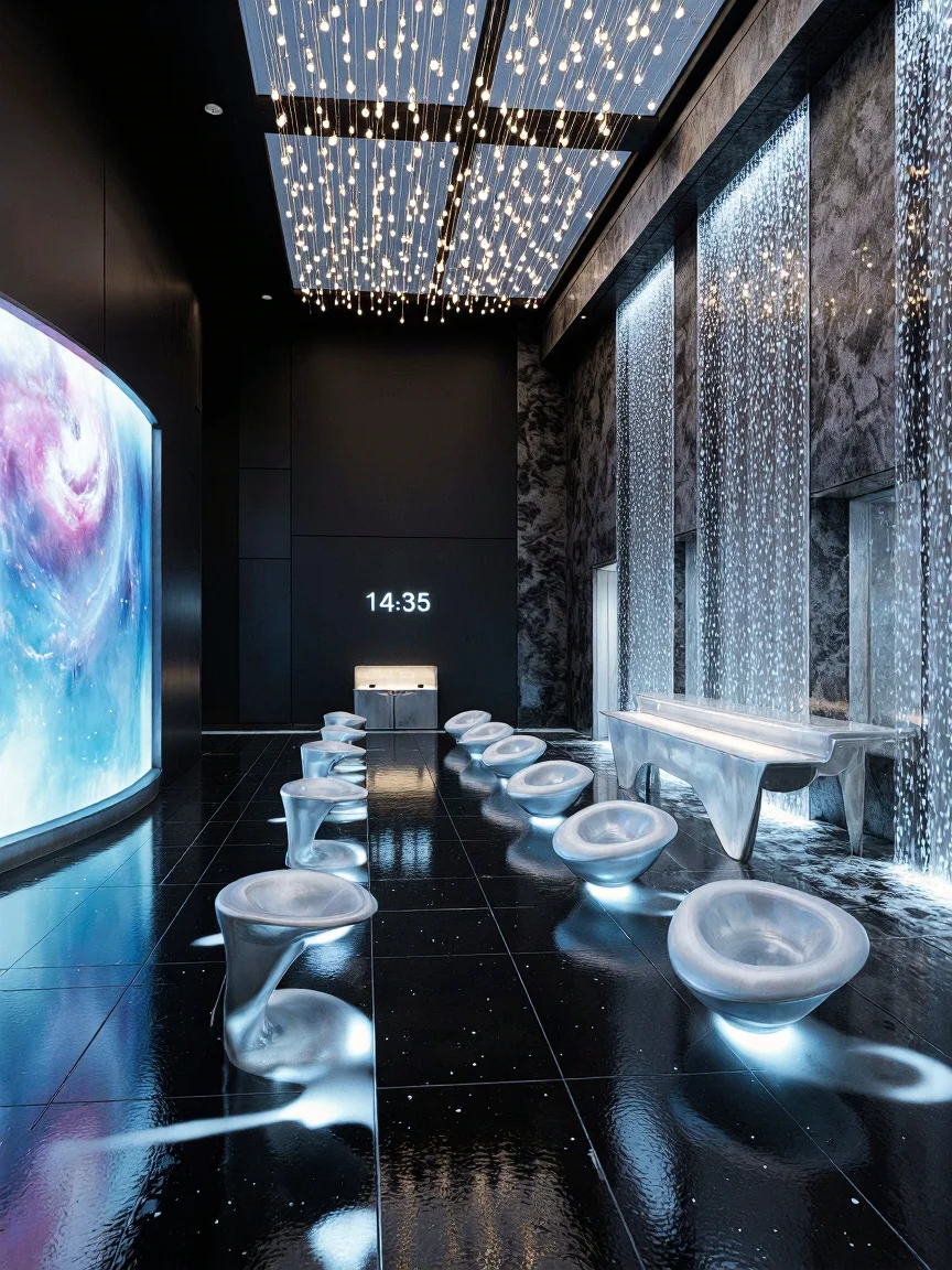 Vestíbulo futurista con techos altos, pared curva de vidrio inteligente que muestra arte galáctico, nanoazulejos negros brillantes con luces LED interactivas, asientos flotantes metálicos, mesa de consola luminosa con reloj holográfico, cascada interior con efectos de luz estelar, candelabro de luces en forma de lágrima levitantes, tragaluz electrocrómico.