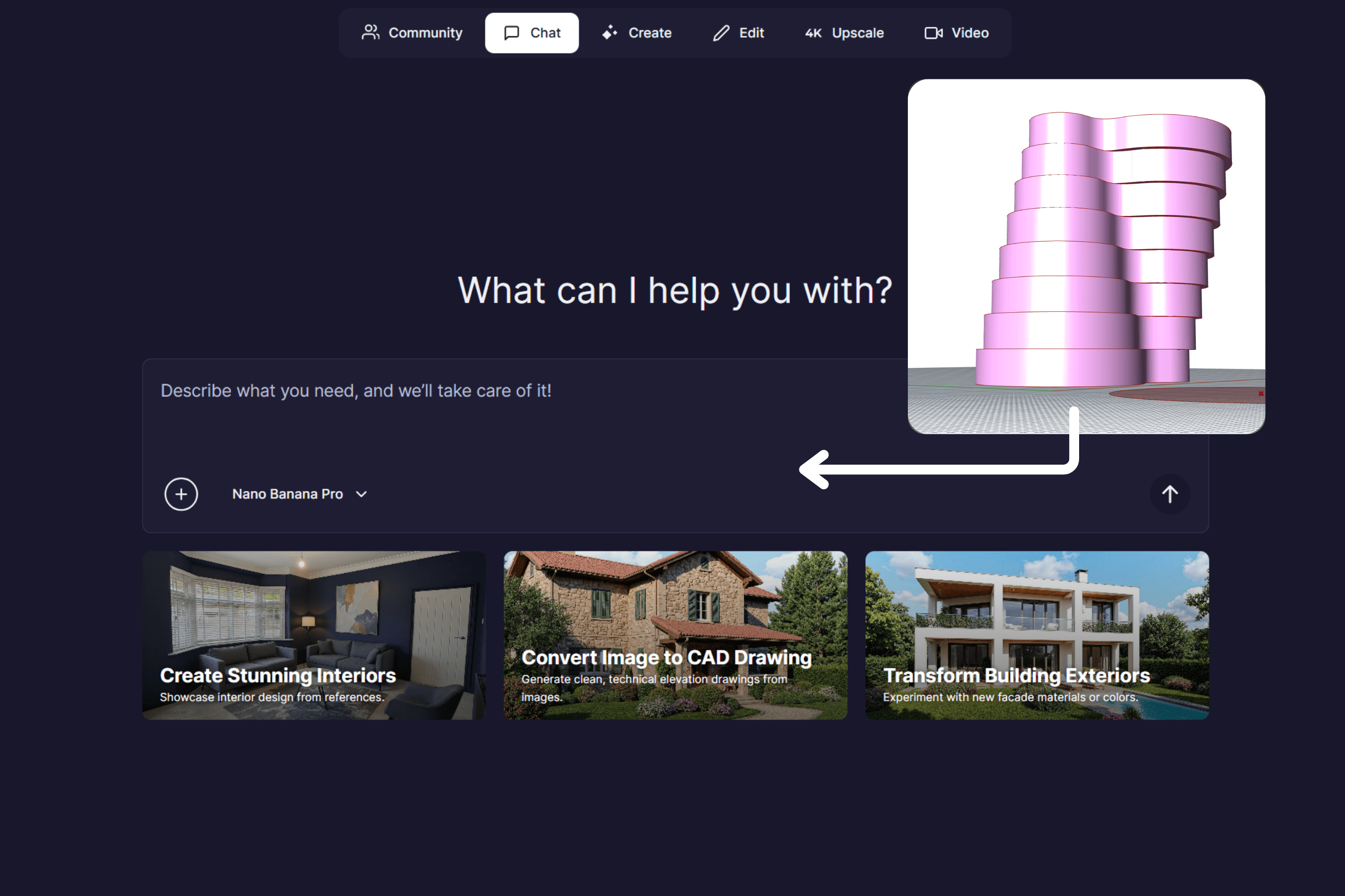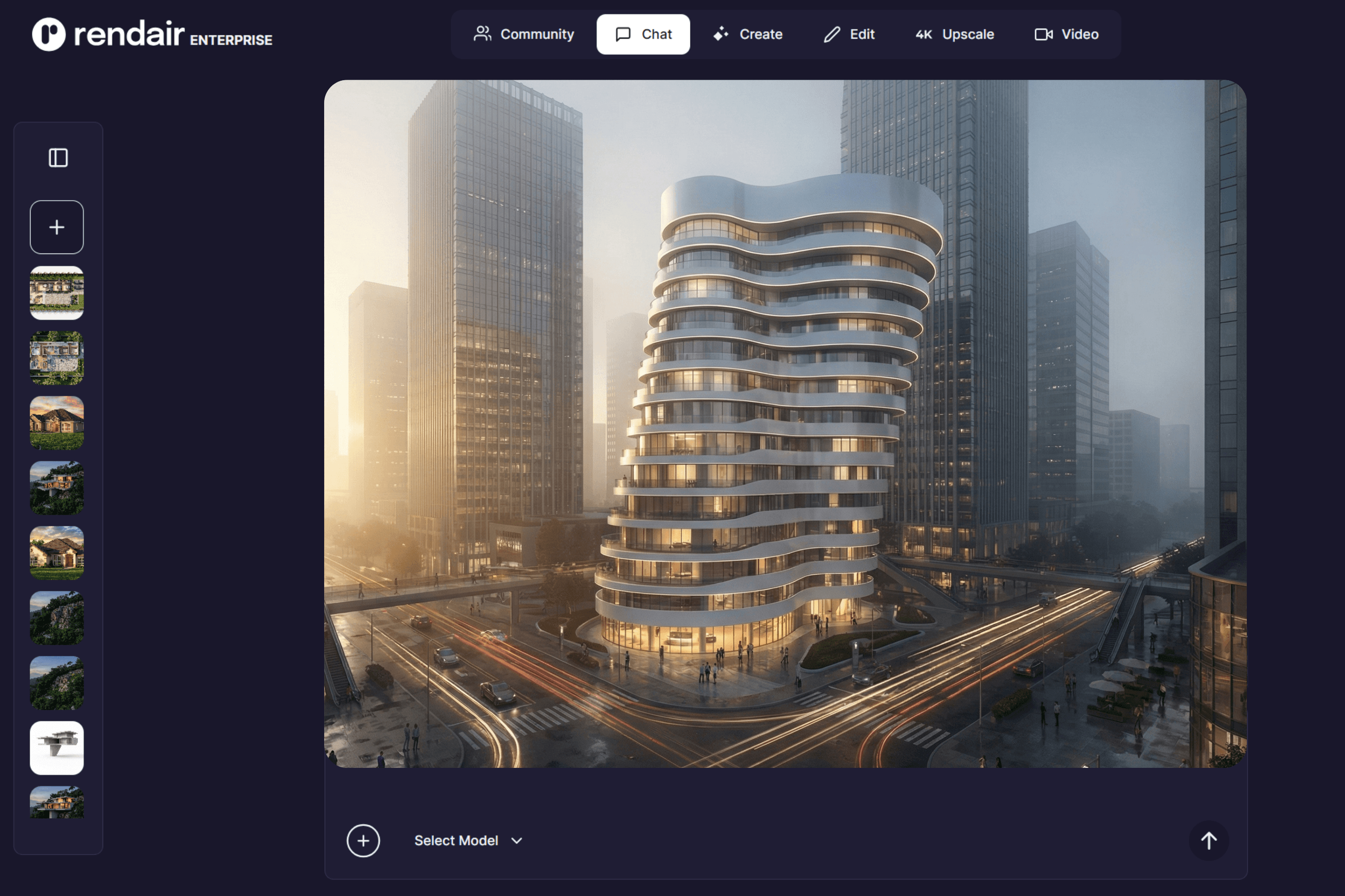 Avec Rendair AI, vous pouvez créer, modifier et réparer des visuels de bâtiment. Passez des blocs aux rendus finaux.