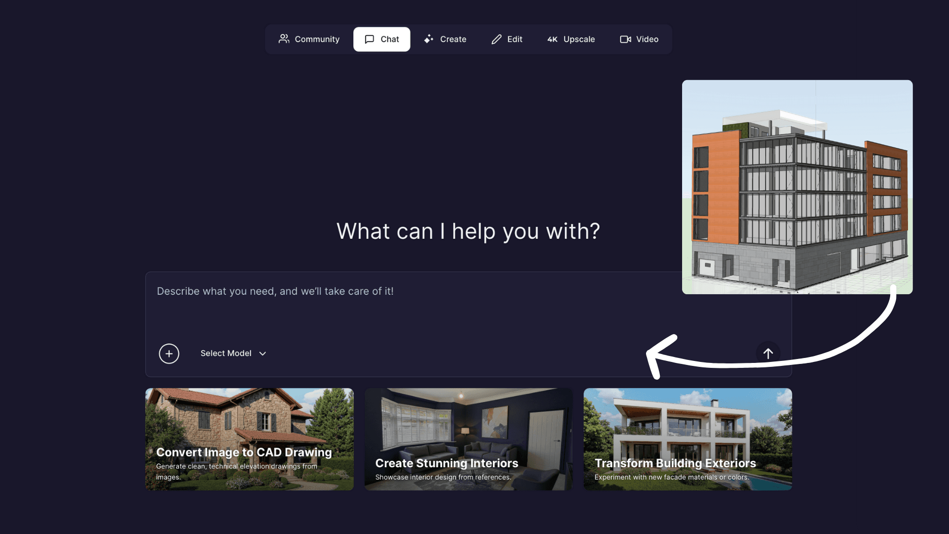Avec Rendair AI, vous pouvez créer, modifier et réparer des visuels de bâtiment. Passez des blocs aux rendus finaux.