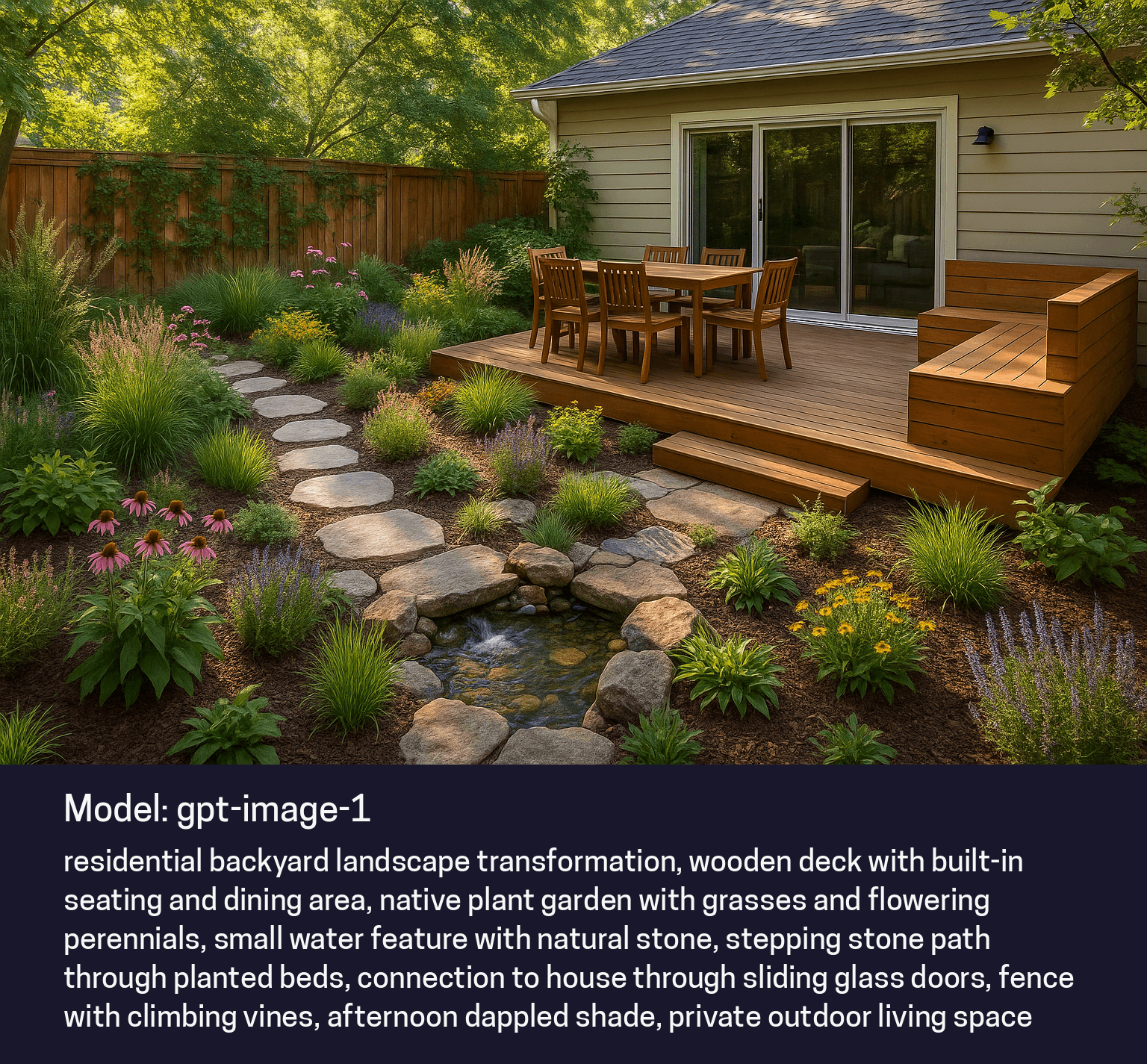 For renovation projects, you can upload a photo of an existing backyard and ask the model to "add a pergola and outdoor kitchen." While GPT Image 1 may alter the surrounding context slightly, it provides a very quick "before and after" impression that is often enough to get a client excited about the potential of a space.
