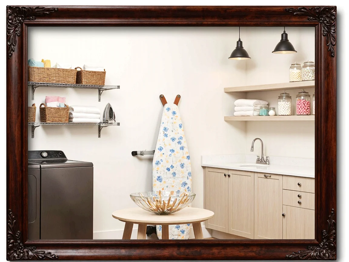 Buanderie moderne dans un grand cadre photo du sol au plafond. Mur blanc coquille d'œuf doux avec un lave-linge-sèche-linge empilable en graphite, étagère en métal minimaliste avec des paniers en osier, planche à repasser avec housse en bleu floral, évier compact avec des robinetteries en chrome, armoire en bois clair, étagères flottantes avec des pots de dosettes de détergent, table pliante ronde en bois clair, lampes pendantes industrielles, cadre ornemental surdimensionné en acajou.