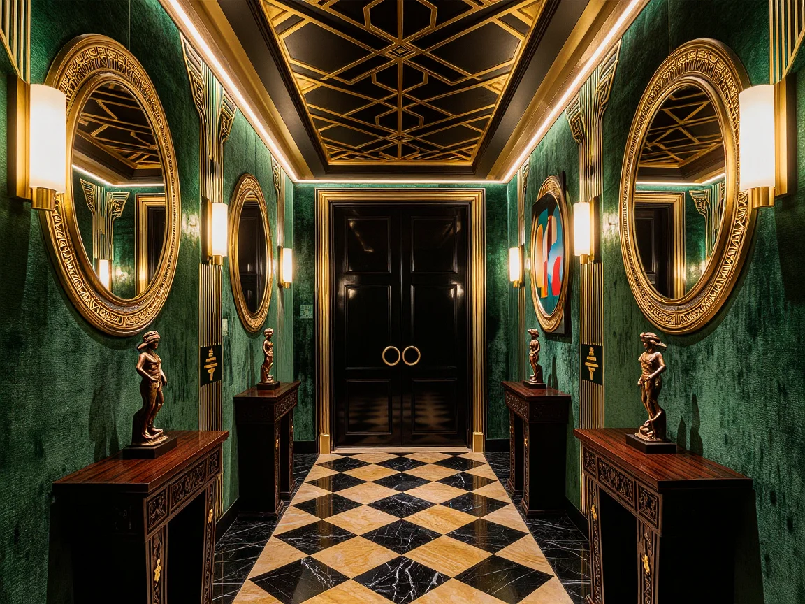 Un couloir Art Déco luxueux featuring des motifs géométriques et des matériaux riches, avec un sol en marbre noir et des carreaux dorés, un papier peint en velours vert émeraude, des miroirs encadrés d'or et des tables d'appoint en éveil sombre avec des statues en bronze. Le plafond a un design caissonné en noir et or, illuminé par des lumières linéaires.