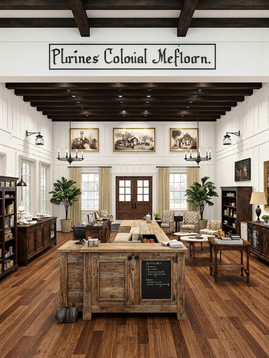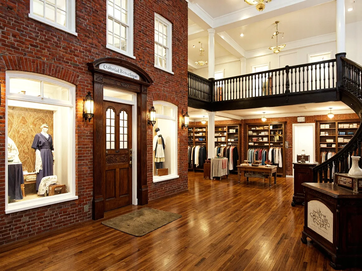 Un design de magasin de détail à deux étages inspiré de l'architecture coloniale, avec un extérieur en brique rouge rustique, de grandes vitrines, un sol en bois dur et un comptoir de caisse antique. À l'intérieur, des porte-vêtements en fer forgé, des étagères en chêne et des lampes suspendues de style lanterne créent une atmosphère chaleureuse.