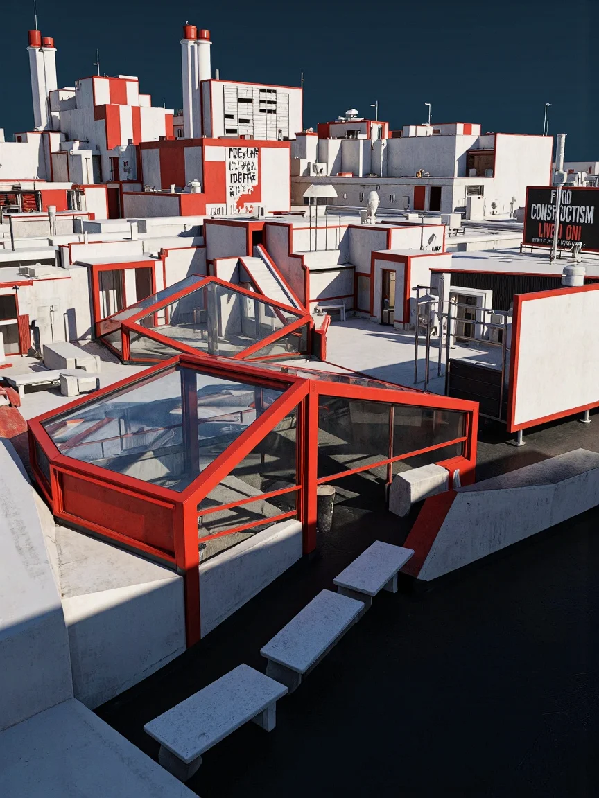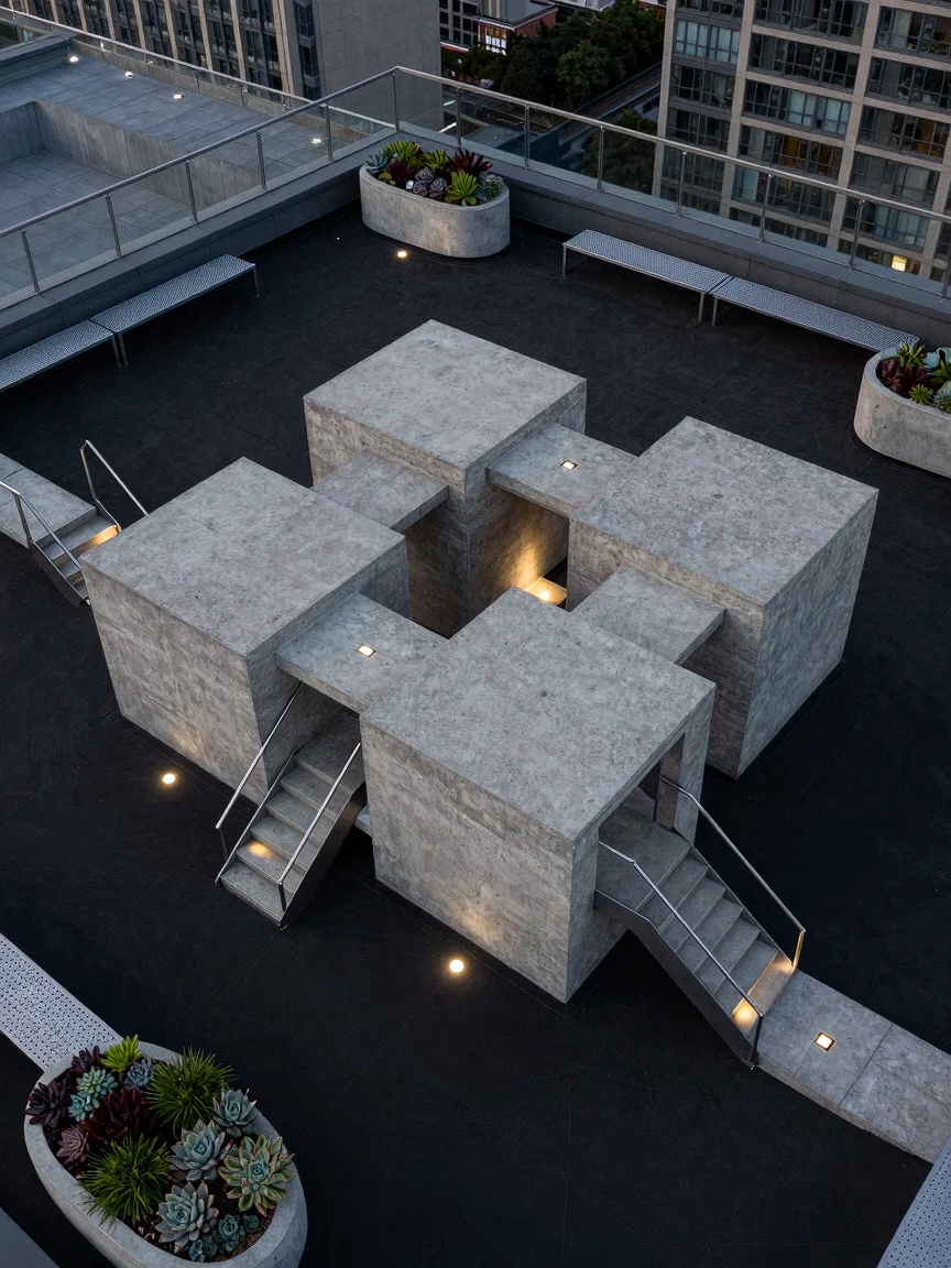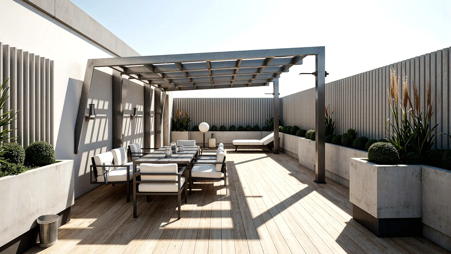 Un design de terrasse moderne avec une terrasse en bois rectangulaire, une pergola en métal géométrique, des meubles d'extérieur linéaires et un aménagement paysager minimaliste avec des jardinières inspirées du cubisme.