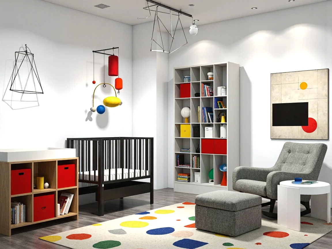 Garderie constructiviste avec des éléments de design géométrique, comprenant un berceau cubique, un mobile abstrait, une table à langer avec des bacs de rangement géométriques, une bibliothèque du sol au plafond, un rocking chair, une table d'appoint ronde, des meubles aux couleurs vives et un tapis à motif.