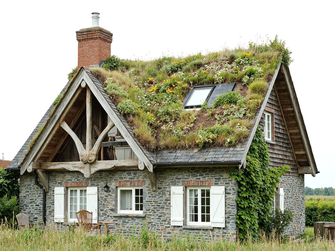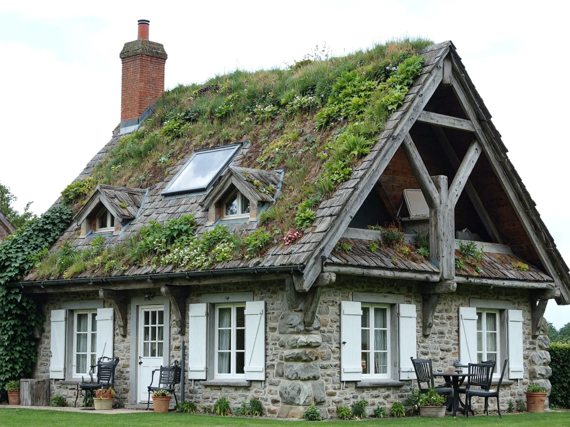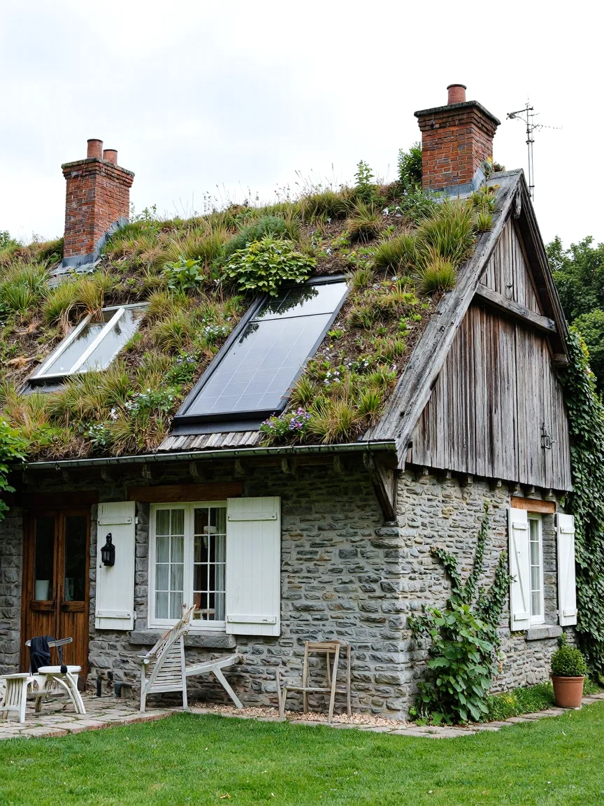 Un chalet douillet avec un toit unique, présentant des poutres en bois rustiques, des fenêtres de grenier triangulaires, un toit vert avec des plantes indigènes, un panneau solaire, un velux, une cheminée en brique couverte de lierre et un coin salon.