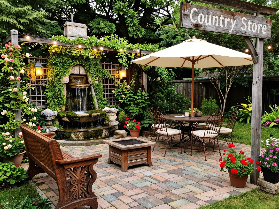 Conception de patio champêtre rustique avec sol en pavés, bancs en bois, foyer extérieur, table à manger antique, fontaine, guirlandes lumineuses, rosiers grimpants, lanternes vintage et géraniums en pot.