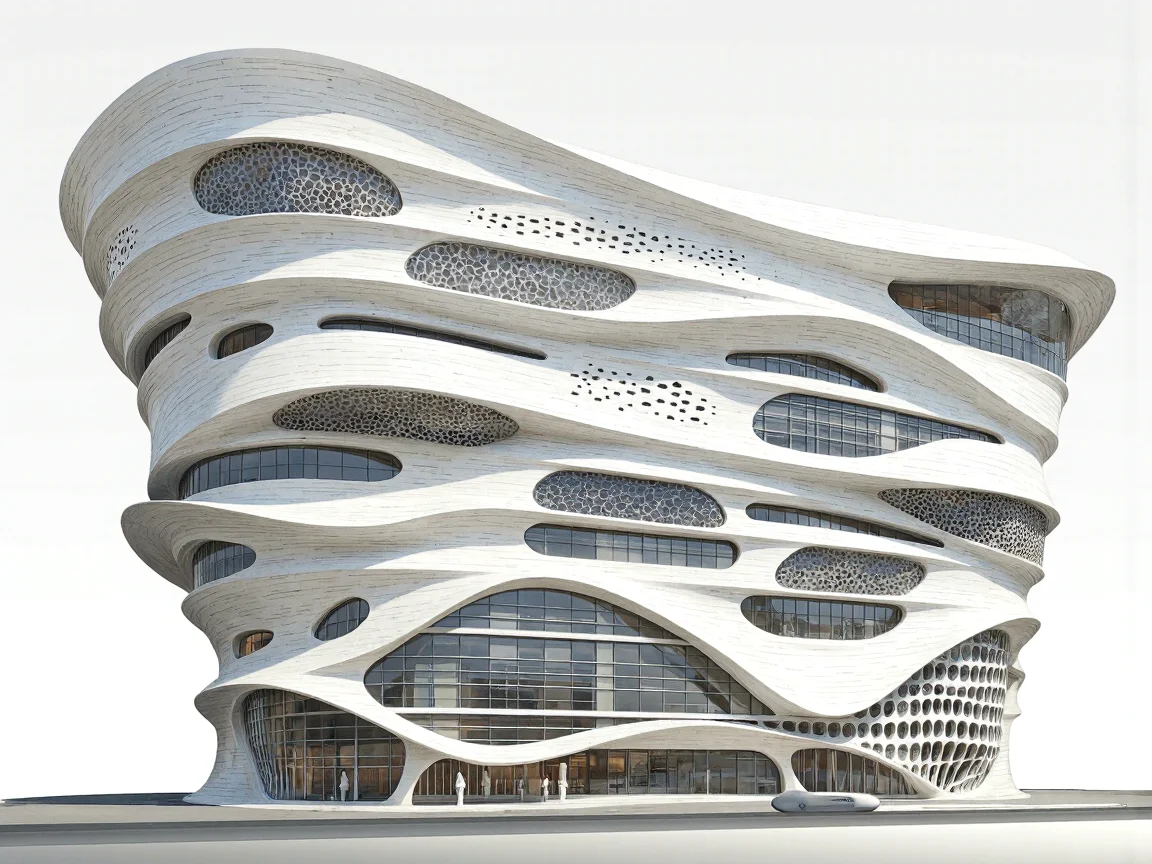Extérieur paramétrique futuriste avec une façade en vague et des motifs géométriques, utilisant des matériaux durables comme le verre et le métal.