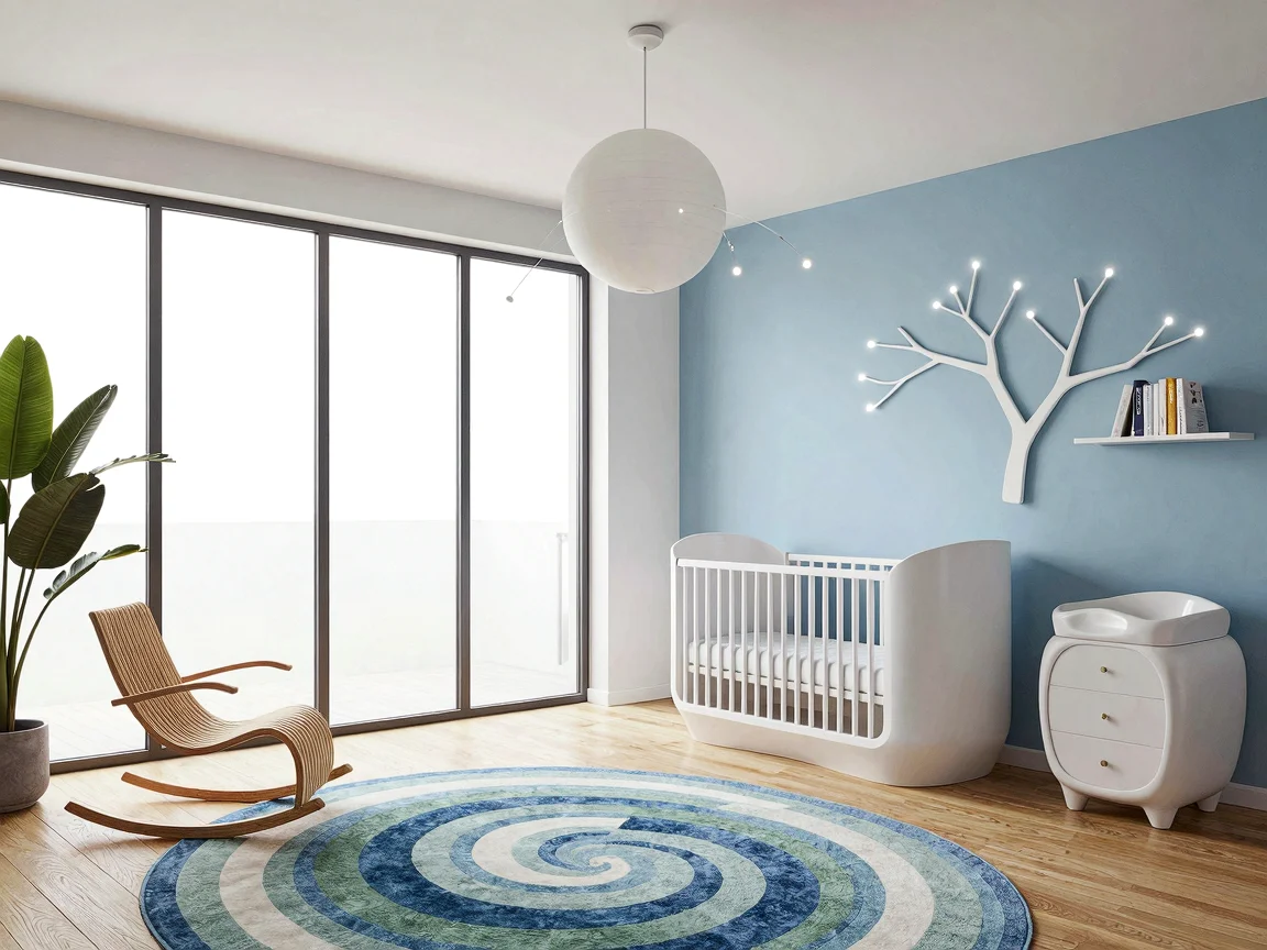 Conception paramétrique 3D pour une crèche moderne avec des fenêtres en verre, des murs bleu pastel et des meubles aux formes organiques.