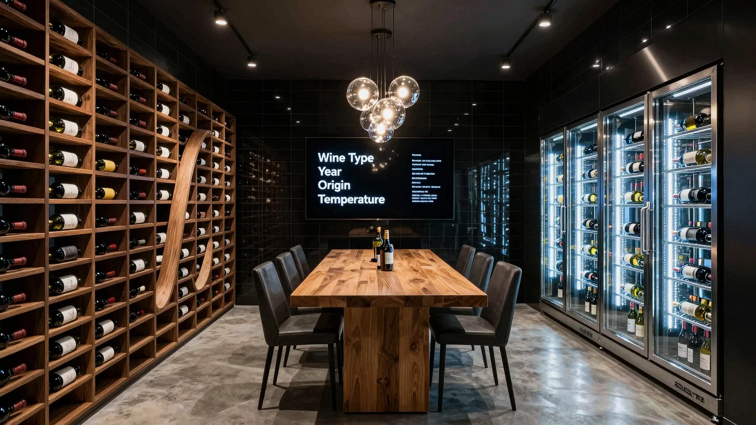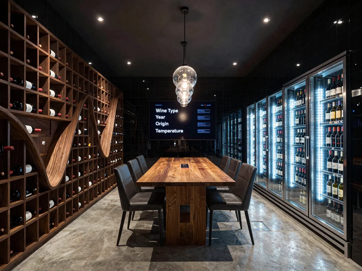 Une cave à vin moderne avec des murs carrelés noirs, un sol en béton poli, un rack à vin en bois en forme de vague, une unité de réfrigération en verre avec un éclairage LED bleu, une table de dégustation en chêne, des chaises en cuir et un écran numérique affichant des informations sur les vins.