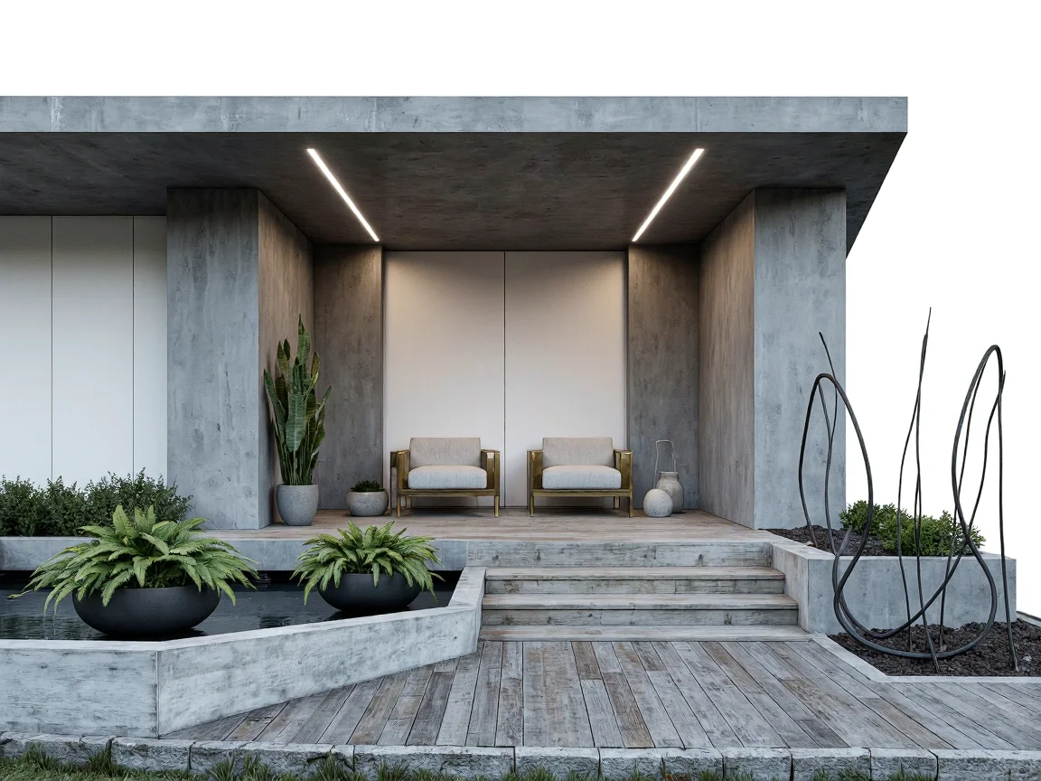 Un porche avant postmoderne avec une architecture géométrique angulaire, un béton poli en gris mat, des piliers rectangulaires asymétriques soutenant un auvent triangulaire plat, des fauteuils sculpturaux avec des accents en laiton, un sol en bois à chevrons rustiques, un jardin non conventionnel avec des jardinières circulaires, une installation d'art abstrait avec des tiges métalliques au-dessus d'un bassin d'eau peu profond, un éclairage LED ambiant doux.