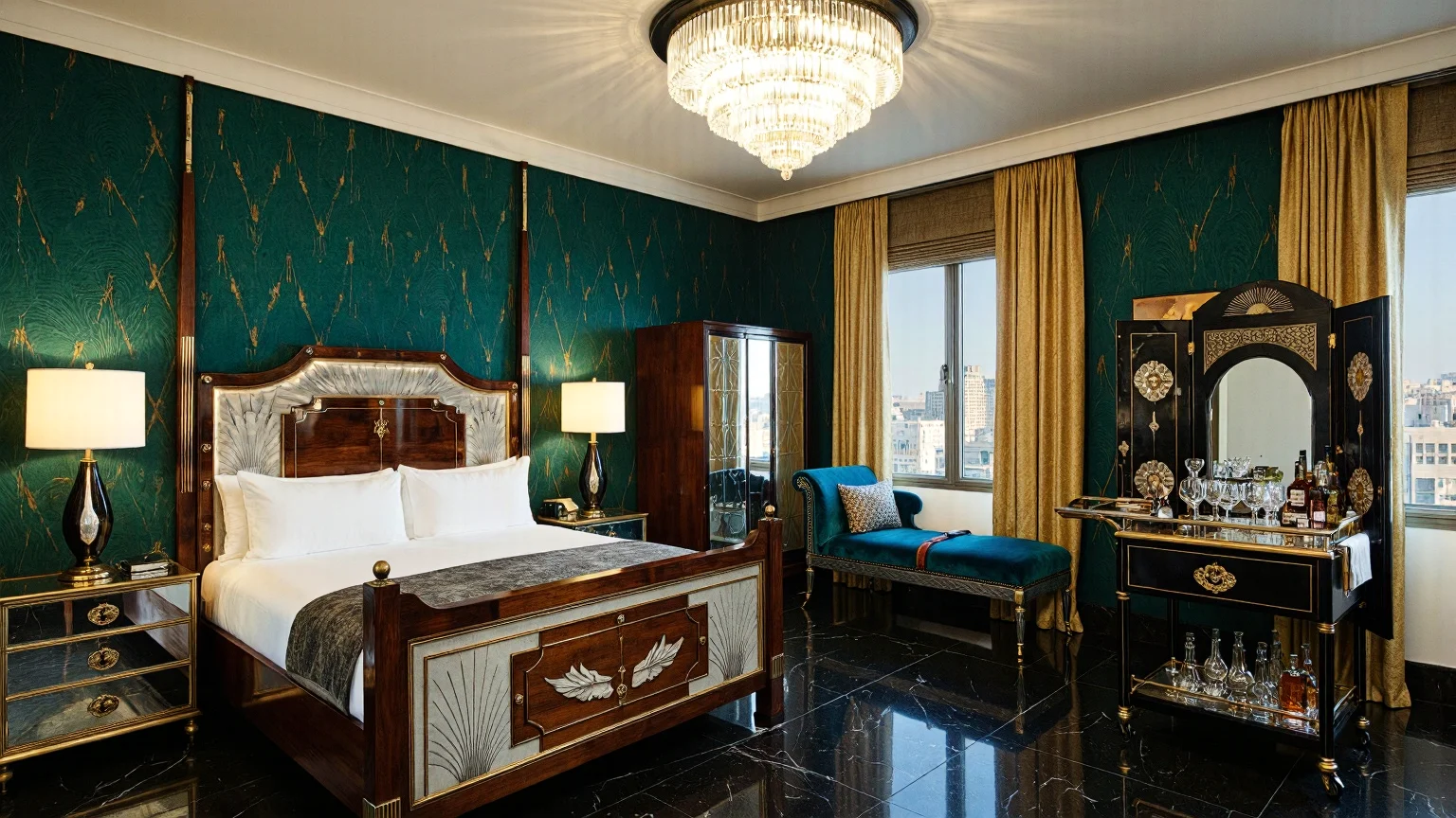 Une chambre d’hôtel Art déco présentant un lit king-size aux motifs géométriques, des tables de chevet en miroir avec d’élégantes lampes, une armoire en ébène avec des accents dorés, une chaise longue en velours bleu paon et un élégant bar à cocktails. La pièce est dotée d’un sol en marbre noir poli et d’un papier peint vert émeraude profond aux motifs dorés angulaires, éclairés par un grand lustre.