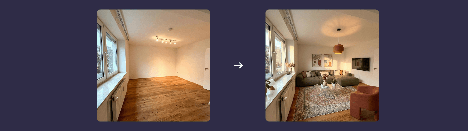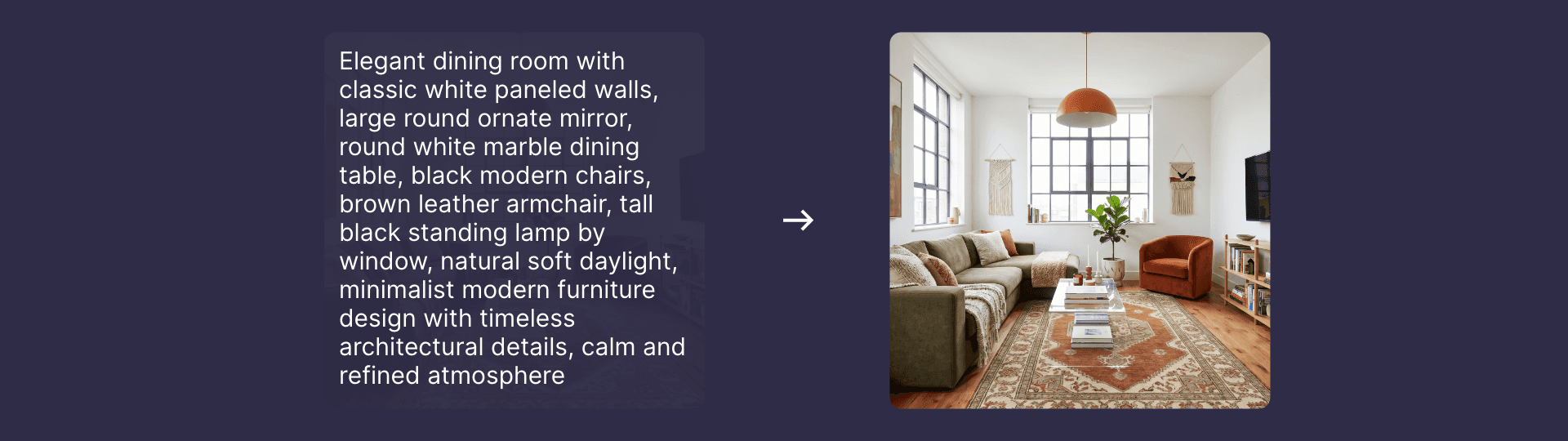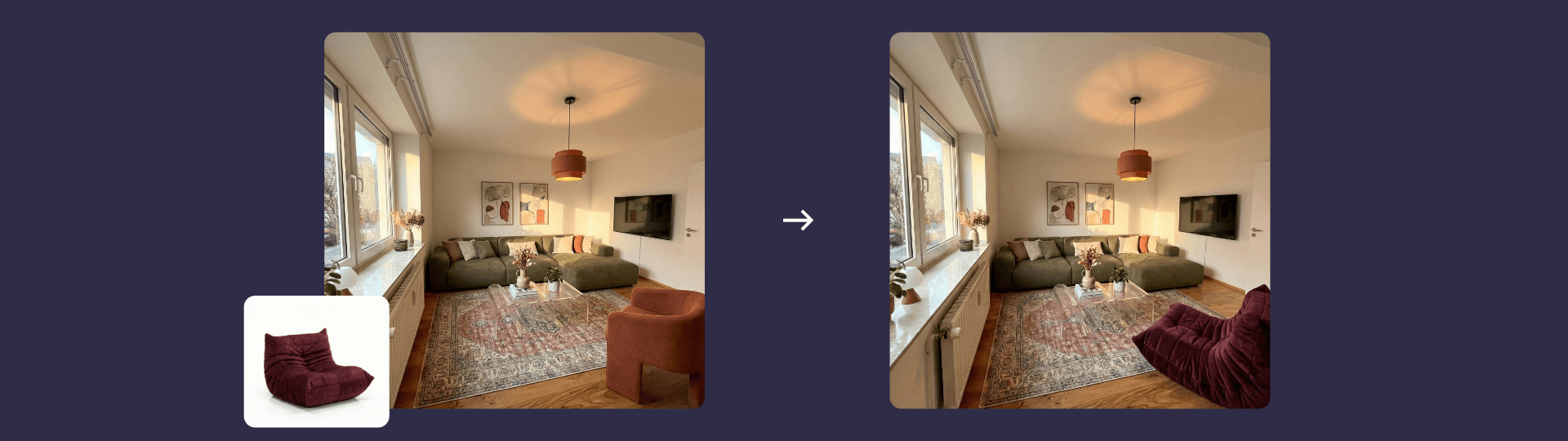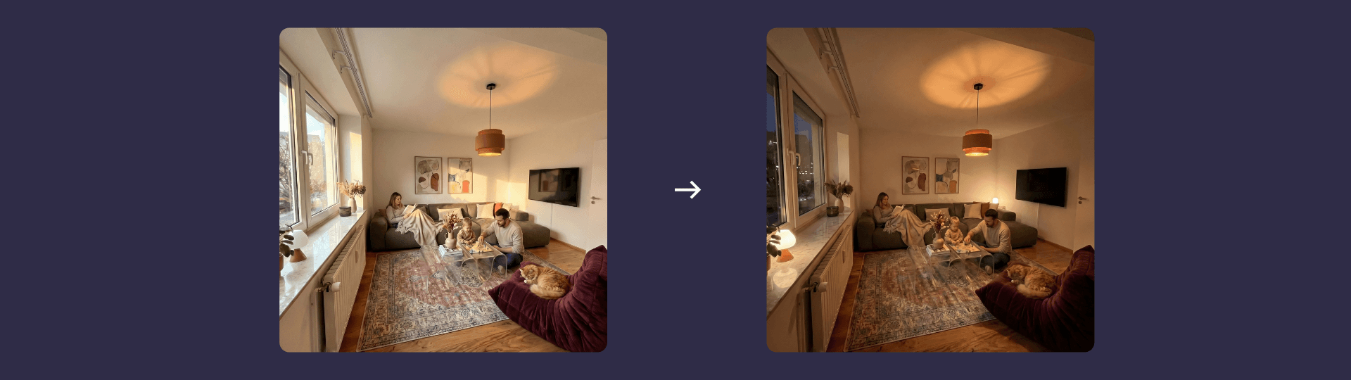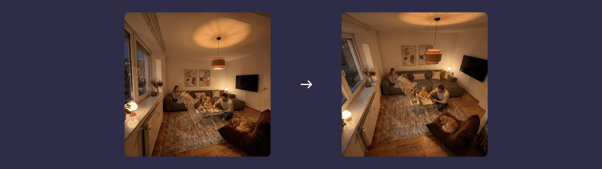 Édition pour corriger les erreurs Nous améliorons l'image ensemble. Modifiez les matériaux, ajustez l'éclairage, ajoutez ou retirez des meubles et affinez les détails.