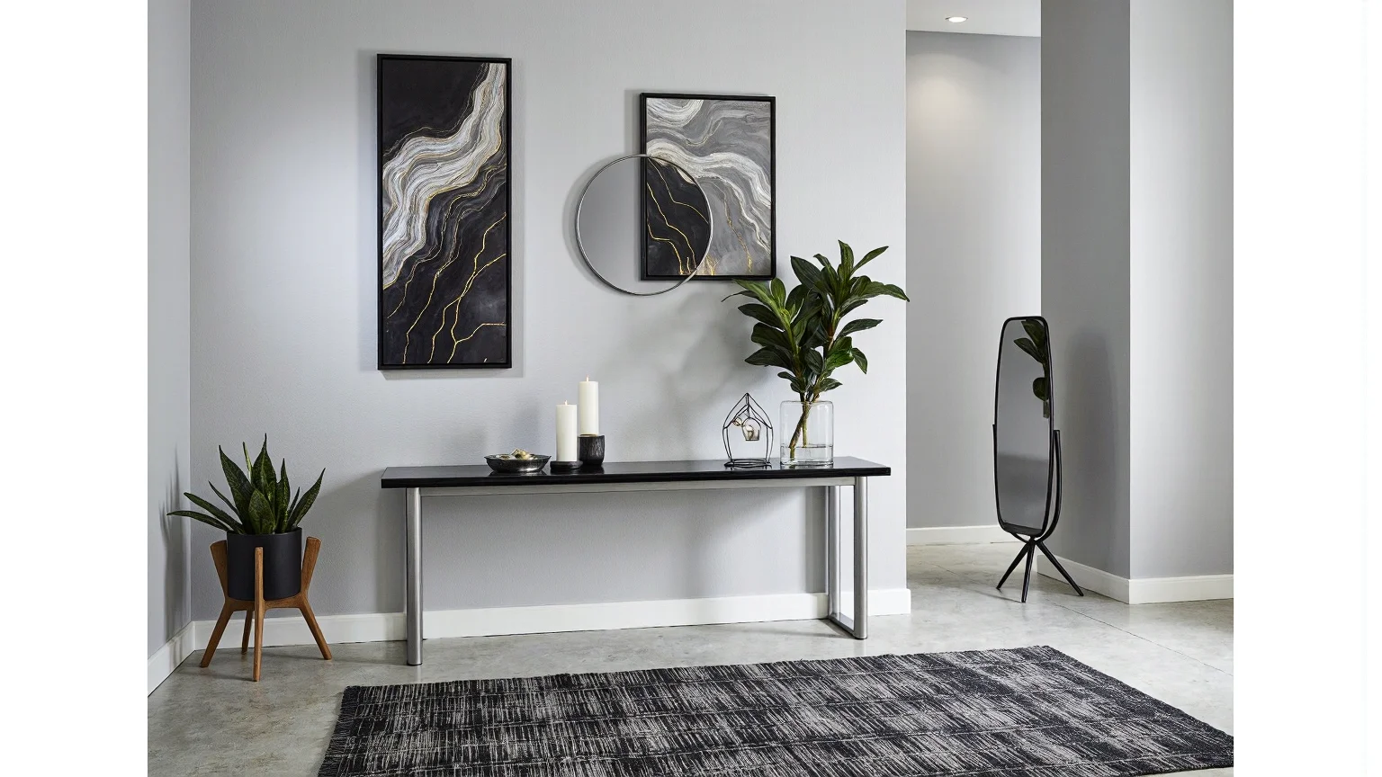 Modern entryway with a sleek black console table, a tall mirror, a potted snake plant, and abstract art pieces.