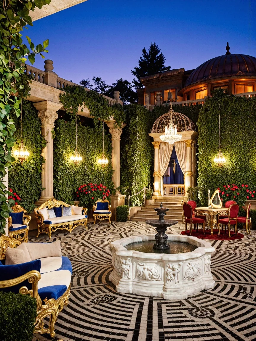 A lavish Baroque style patio featuring a grand white marble fountain with cherubs, surrounded by black and white cobblestones, gilded pillars with climbing ivy, wooden benches with blue cushions, and an ornate dining area with a gold table and red cushions under a crystal chandelier. Boxwood hedges with blooming roses and a mahogany gazebo completes the scene under a twilight sky.
