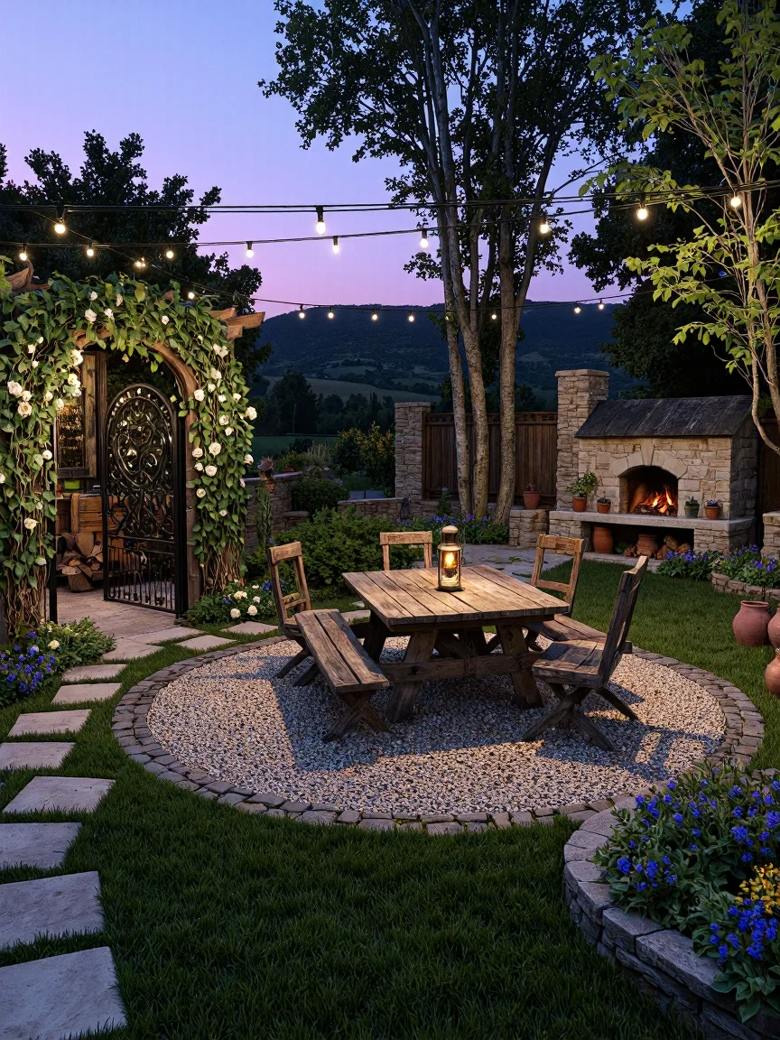 Rustic backyard with a wooden picnic table, lanterns, cobblestones, wrought-iron arbor gate, stone fireplace, potting bench, mature trees, wildflowers, rolling hills, and a treehouse.