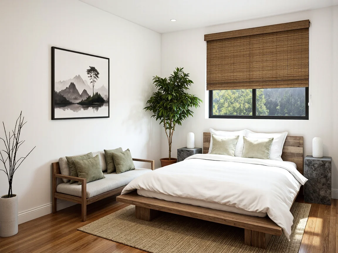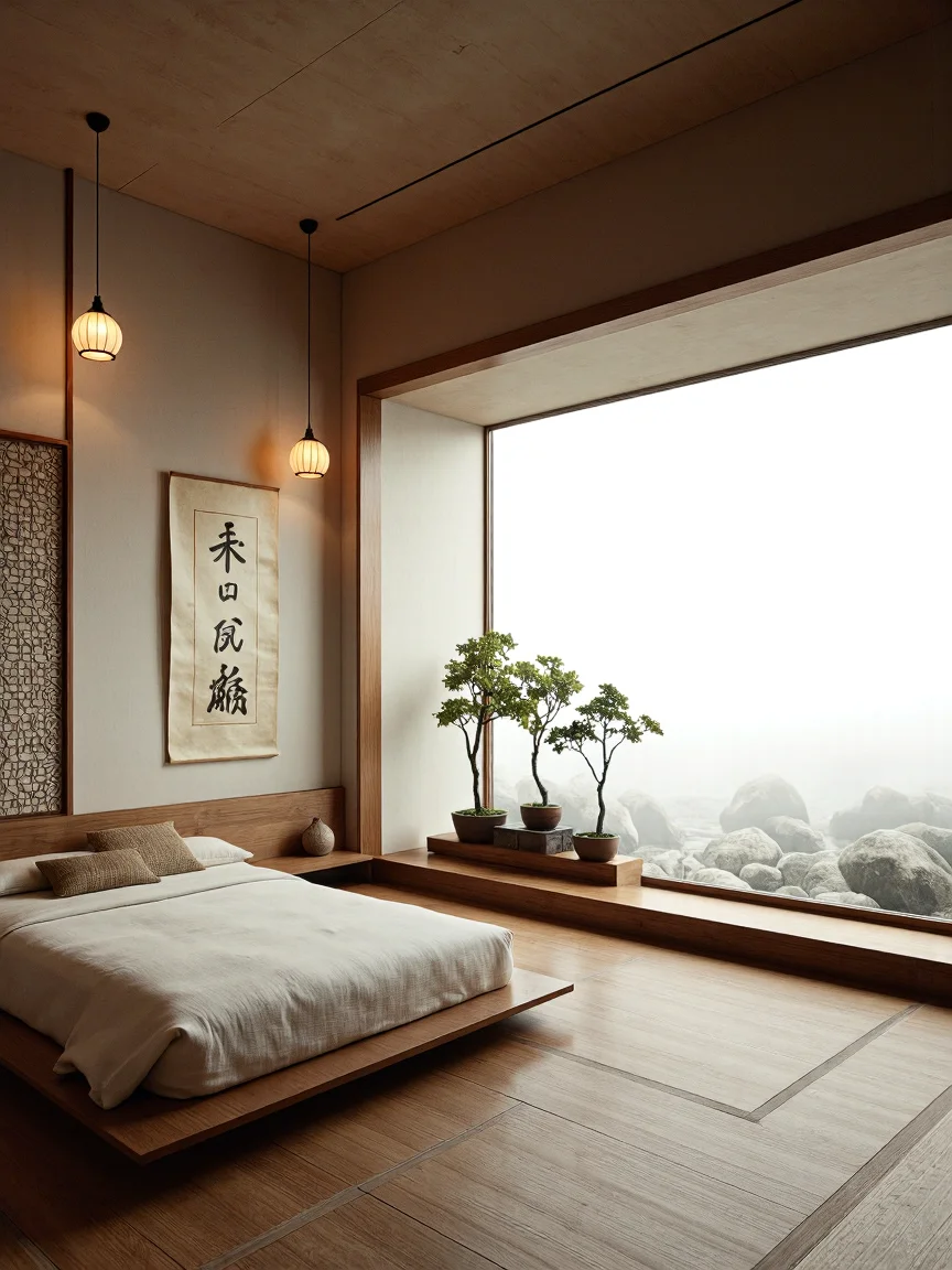 Zen bedroom design with a low-profile teak bed, shoji screen, meditation space, tatami mat, bonsai trees, and soft lighting.